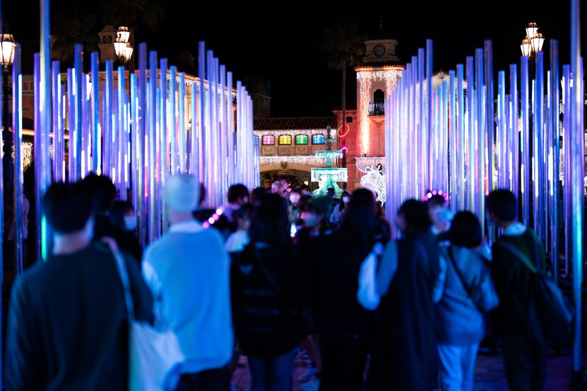 イルミネーションファサードからキッズパークやクリスマスマーケットへのルートとなる橋の上に現れたのは200本以上もの光柱からなる華やかな光の歩廊。それぞれに存在感のある輝きが幾重にも重なり、さまざまな表情が生まれます。通りすぎる瞬間、光たちの呼応を感じながら光と音楽に包まれる体験をお楽しみいただけます。