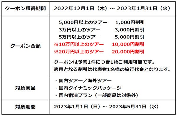 旅行割引クーポンは、配布期間内(2022年12月1日~2023年1月31日)に当社ウェブサイトから旅行代金に応じて1,000円から最大20,000円分まで取得することができます。クーポンの配布総額は1億円で、上限に達するまで何度でも獲得が可能です。対象期間は2023年1月1日~3月31日で、この期間に出発する対象の国内・海外旅行商品に使用することができます。