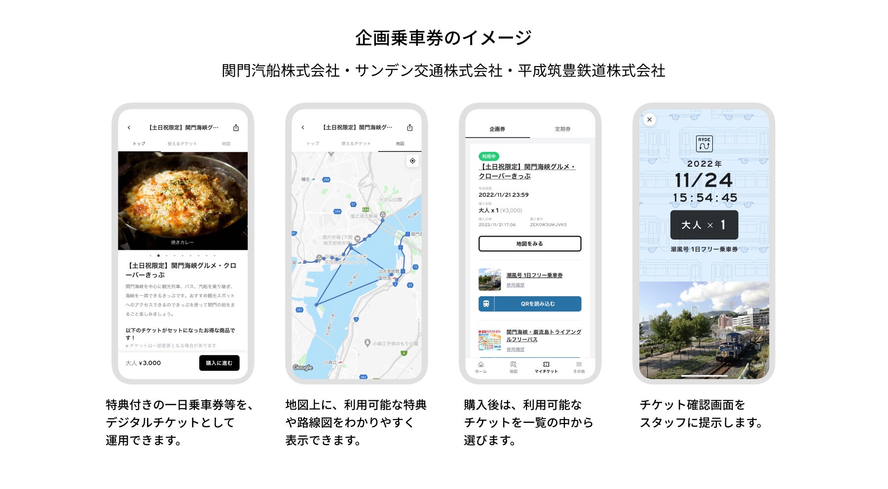 「RYDE PASS」では、北九州及び山口エリアの商品の取り扱いは初となります。関門海峡エリアで運行する平成筑豊鉄道、関門汽船およびサンデン交通のトロッコ列車および、船やバスの乗車がデジタル乗車券で可能になるほか、エリア内の対象店舗にてご当地グルメなどをお得にご利用いただけます。また、アプリ上での事前決済も可能なため、スマートフォン1つでより便利に快適に関門海峡の観光をお楽しみください。