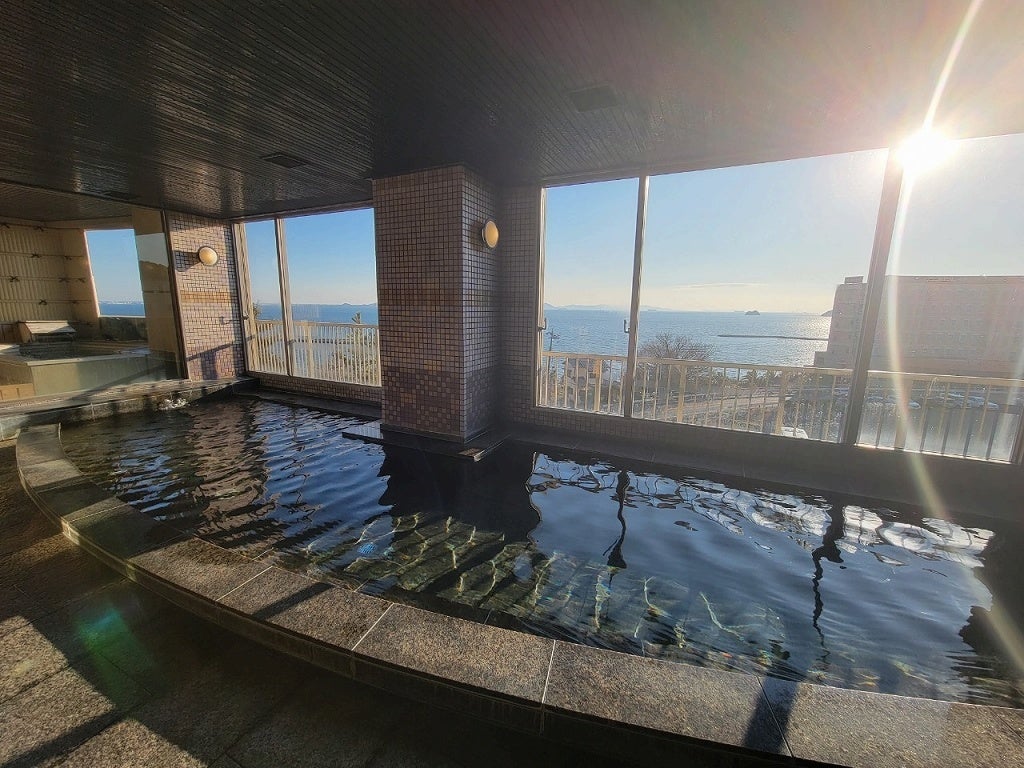グランピング宿泊者はホテル三河 海陽閣の温泉を利用することができ、広い浴場と壮大な三河湾の景色に癒されながら、心も身体もリラックス。