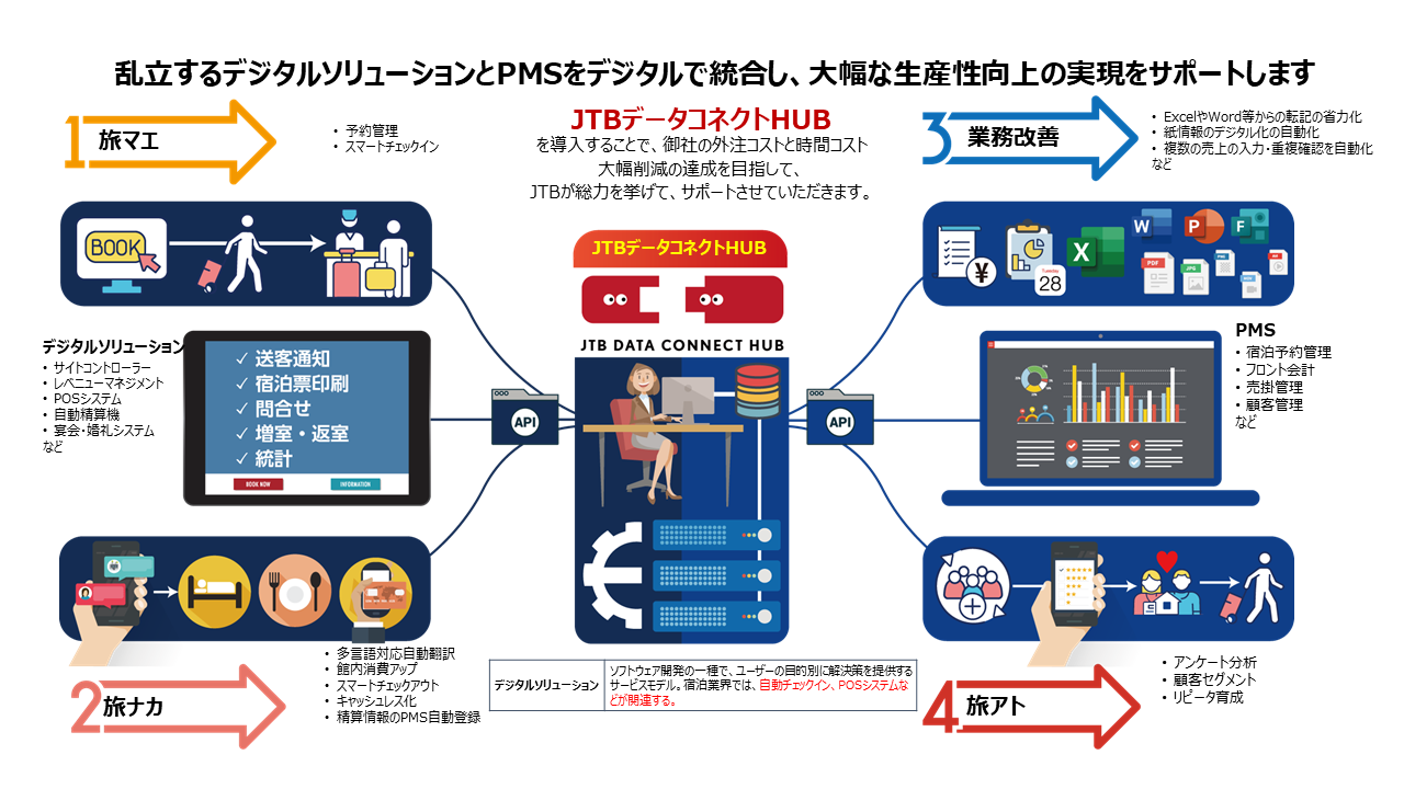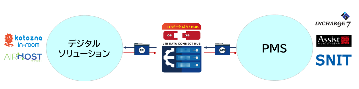 また、PMSとデジタルソリューションには複数の事業者があり、接続する際に発生する費用が課題でした。「JTBデータコネクトHUB」は、データをつなぐAPI※2を共通化することで、デジタルソリューション導入の障壁であるコスト負担も低減し、宿泊事業者がデジタルソリューションを導入しやすくします。