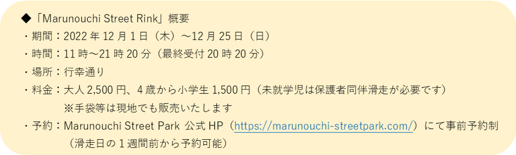 Marunouchi Street Parkとしては初めての展開となる東京駅前の行幸通りでは、環境配慮型の樹脂製スケートリンクを使用した「Marunouchi Street Rink」が登場。東京駅前という象徴的な場所で非日常を体験することができます。