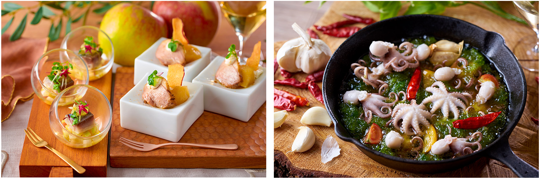 右:ガーリックのきいたオイルに素材の旨味が溢れる開業以来の人気メニュー、アヒージョはイイダコとあおさでご用意いたしました。スパークリングワインや白ワインとご一緒に。