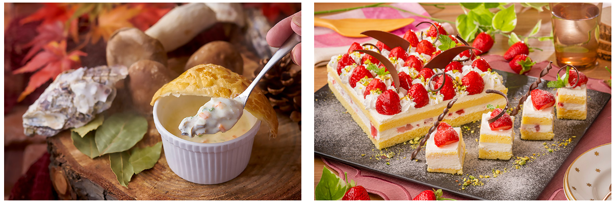 右:子供も大人もみんな大好きいちごをたっぷり使った「NYショートケーキ」。フレッシュいちごの他にも、ストロベリーリキュールやストロベリージャムなど、いちご尽くしの甘酸っぱい味わいが魅力の一品。