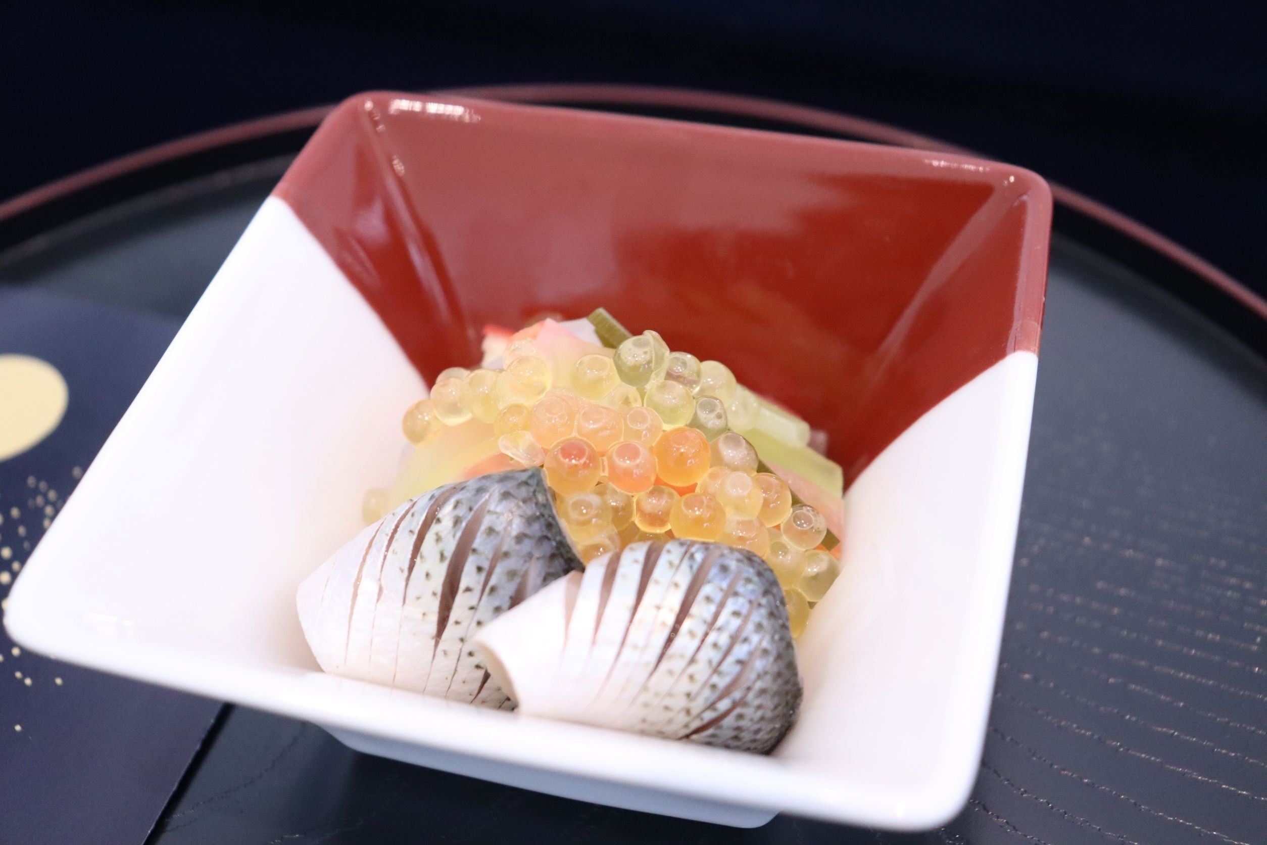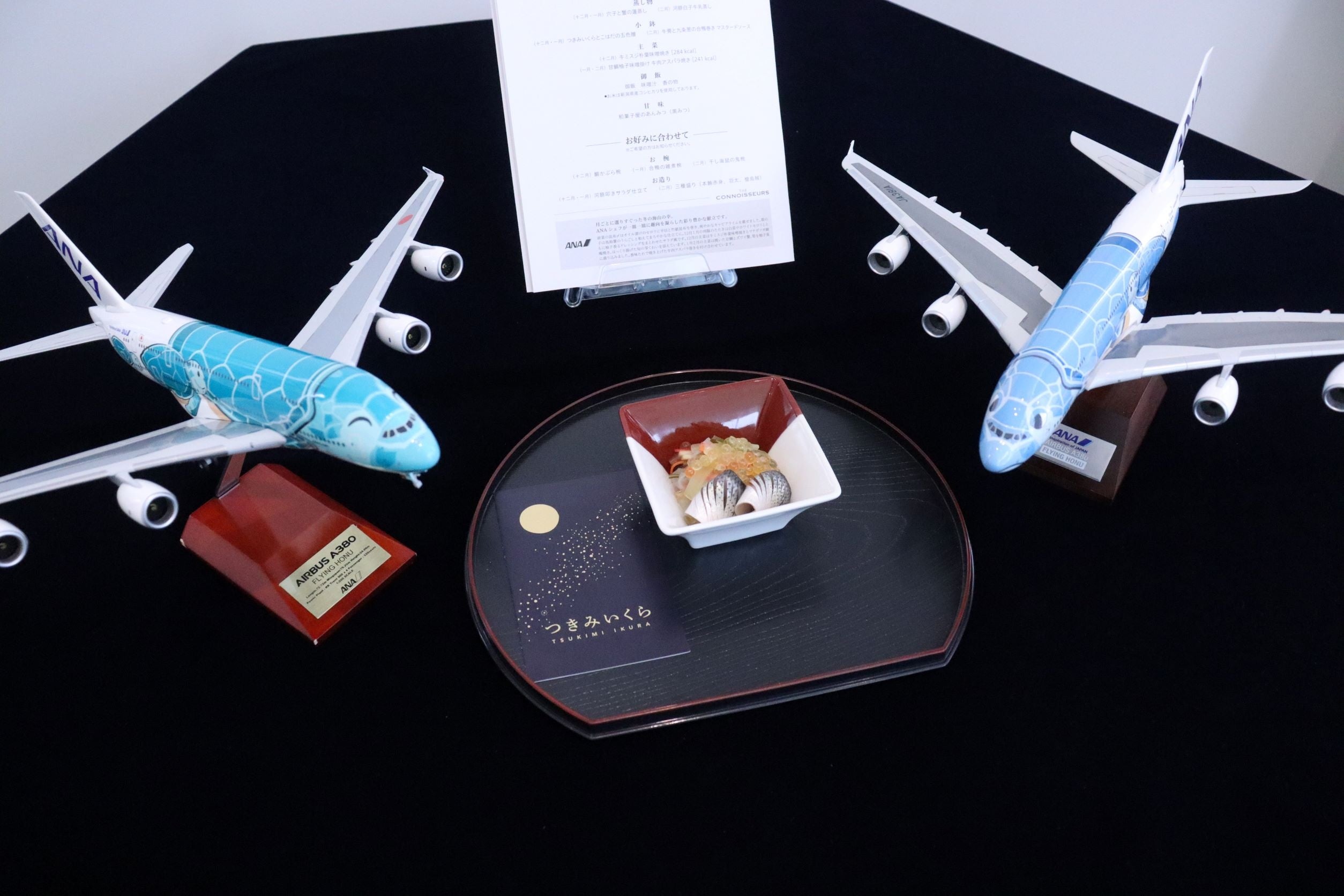 つきみいくらは美しさと味に定評あり、ANA和食料理長 森 誠剛 氏の「つきみいくらは、黄金色に輝く色味と鰹風味でプツプツとした食感が、料理を創る中でもとても魅力的な食材と感じ、ぜひANAにご搭乗されるお客様に召し上がっていただきたい。」との思いから、国際線ファーストクラス機内食への採用に至りました。