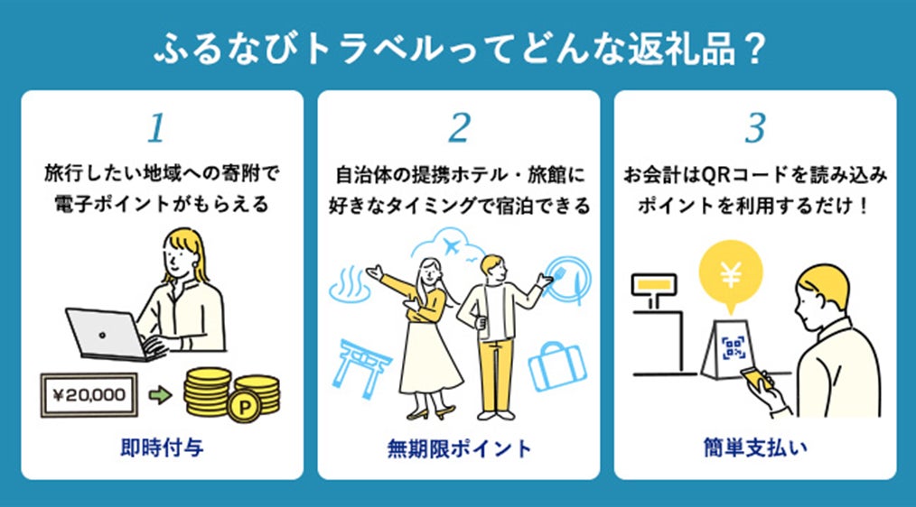 ふるさと納税先にある提携ホテル・旅館で利用可能な、無期限の電子ポイント(トラベルポイント)が返礼品として付与される、初めての方にも判りやすいふるさと納税サービスです。