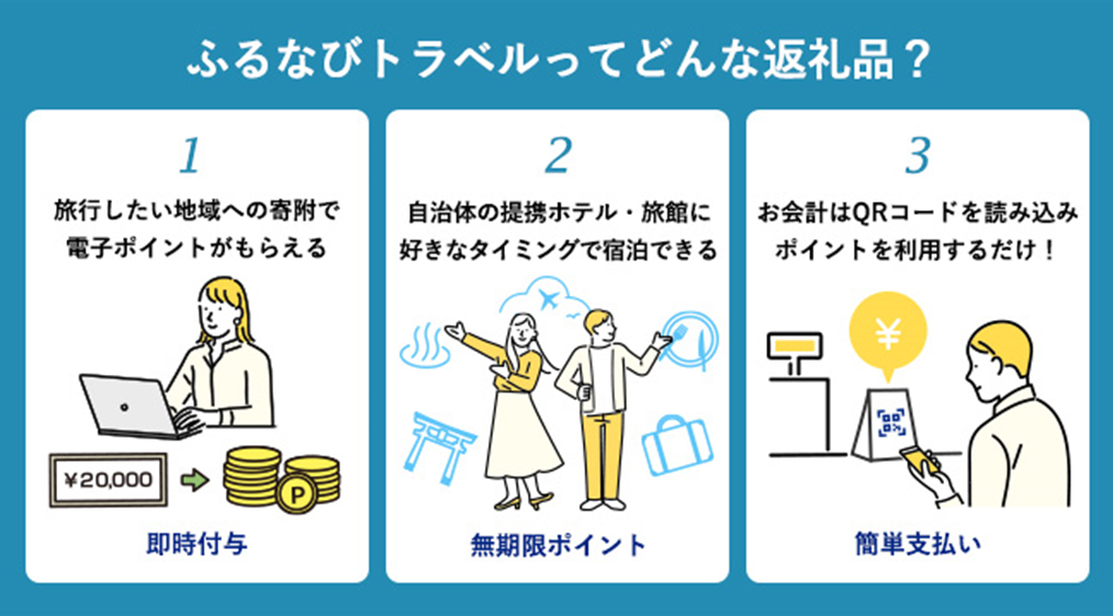 ふるさと納税先にある提携ホテル・旅館で利用可能な、無期限の電子ポイント(トラベルポイント)が返礼品として付与される、初めての方にも判りやすいふるさと納税サービスです。