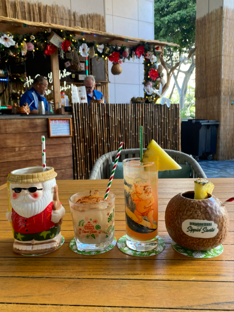 プリンス ワイキキのロビーと広々とした屋外パティオは冬のワンダーランドに変身。赤と緑のハイビスカスが印象的なホリデーライトを施し、魔法のように照らされたエントランスを進むと現れるのが、ホリデー限定のポップアップバー「シッピン サンタ」。ティキをテーマに南国のクリスマスをイメージし、ラムやウォッカをベースにしたトロピカルなホリデーカクテルを多数ご用意しています。カクテルが入った個性豊かなホリデーカップも人気のひとつで、サンタモチーフや、ココナッツ、サーフィンサンタのマグなど、他では見られない個性的なカップでホリデー気分を盛り上げます。また、ローカルミュージシャンによる生演奏も毎晩実施いたします。