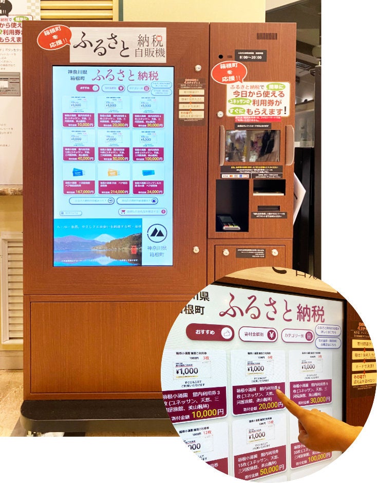 全天候型の温泉アミューズメントパーク、箱根小涌園ユネッサン(所在地:神奈川県足柄下郡箱根町ニノ平1297、支配人:松山 元信 以下:ユネッサン)の館内には、グローキーアップ株式会社(所在地:神奈川県藤沢市藤沢607番地1、代表取締役:鍵和田 芳光)が開発した「IoTふるさと納税 自動販売機」(以下:自販機)が設置されており、本年4月より箱根町(所在地:神奈川県足柄下郡箱根町湯本256、箱根町長:勝俣 浩行)に対するふるさと納税を受け付け出来るようになりました。