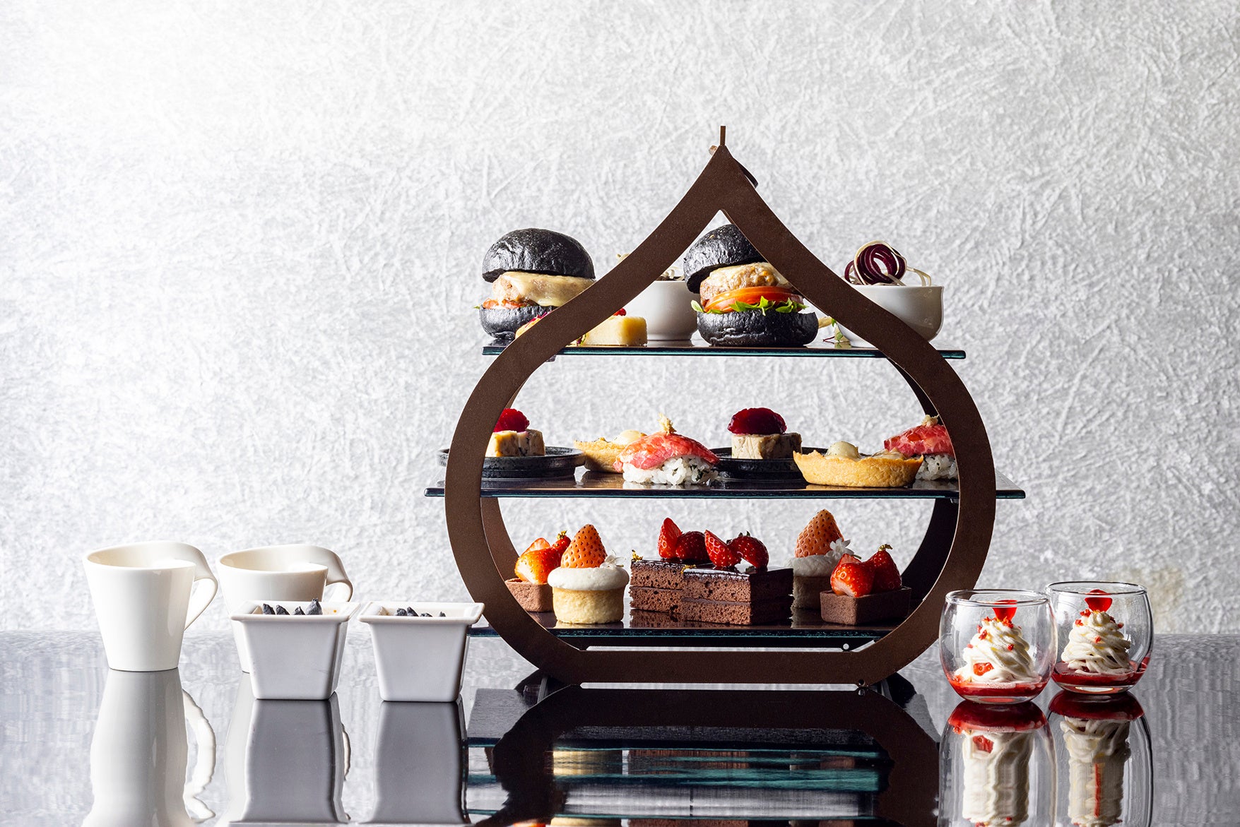 2023年の幕開けを飾るアフタヌーンティーは、「ブラック&ホワイト」をテーマにさまざまないちごのスイーツをお楽しみいただけます。なかでもおすすめは千葉県山武市の相葉苺園で栽培された黒いちご「真紅の美鈴」を使用した「黒いちごのタルトレット」。ジューシーで糖度が高く果肉までも赤い黒いちごは抗酸化作用が期待されるアントシアニンが多く含まれているとされ、濃厚なショコラのガナッシュとの相性が抜群です。黒いちごと対比をなす白いちごは「淡雪」を使用した「白いちごのタルトレット」です。薄い桜色の見た目も可愛らしい白いちごはサクサクとした抹茶ガナッシュ入りタルトにたっぷりのホイップクリームを合わせました。また、白いマンドリアーノチーズがかかったパテと野菜を、竹炭を練り込んだ黒いバンズで挟んだミニビーフスライダー、キャビアを添えたポロ葱と帆立貝のフランなどのセイボリーも黒と白の競演をご堪能いただけます。さらに人気のワゴンサービスは黒と白のスコーンやサンドイッチ、ベーグルなどをお好きなだけお楽しみいただけます。
