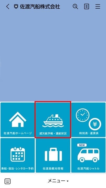 当社を利用されるお客様のみちしるべとなるよう、「たびもんのみちしるべ」と題し、航路別・船別に 1 週間の就欠航予報を配信いたします。 LINE メニュー「就欠航予報・運航状況」からご確認頂くことができます。 下記の LINE メニュー「就欠航予報・運航状況」をタップすると、就欠航予報・当日の運航状況が表示されます。