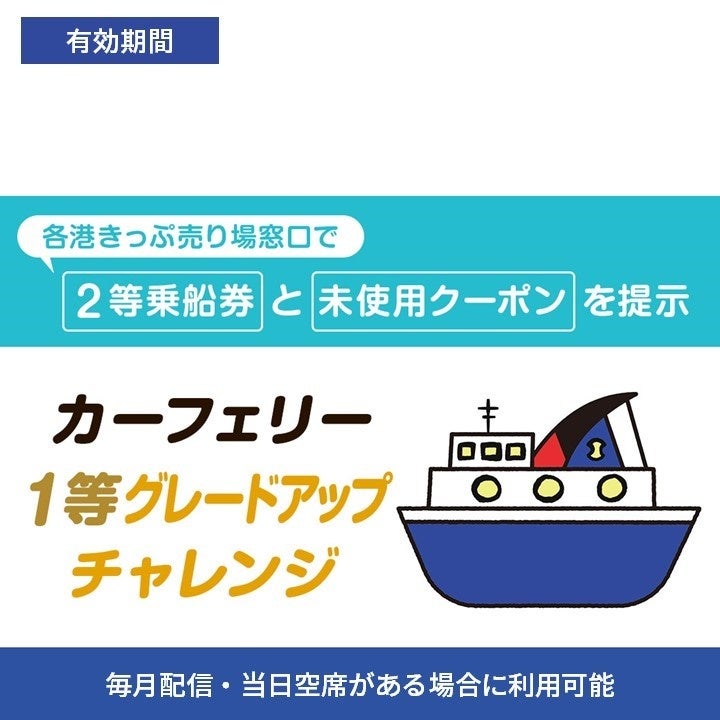 毎月初めに、抽選でカーフェリー1等席に繰り上がることができる「1等グレードアップチャレンジ」を開始します。当選結果はその場ですぐに分かり、当選したお客様は、配信した月の1カ月期間内に、カーフェリー2等きっぷと未使用の当選したクーポンを各港の窓口でご提示頂くと、1等席にグレードアップすることができます。(年末年始や大型連休等の特定日除く)