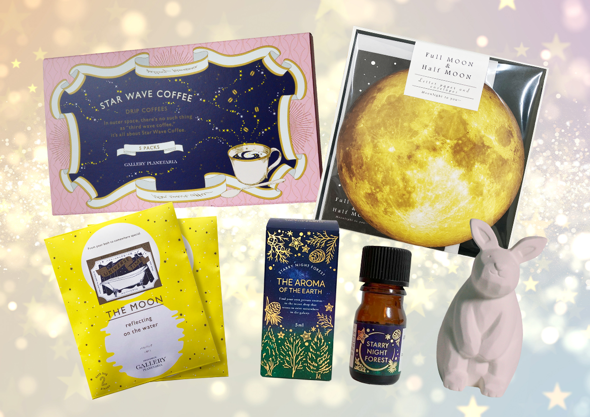 うさぎの形をしたアロマストーンとオリジナルアロマ、満月モチーフの入浴剤や便せんのほか、ムーンライトブレンドのコーヒーをセットにしました。