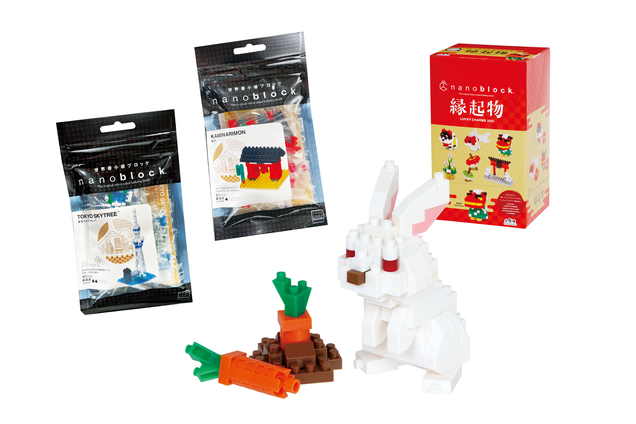 新商品のかわいらしいにんじんが付いた「干支 卯」と、縁起物やミニ情景シリーズのほか、1万円相当のナノブロックが入った福袋です。