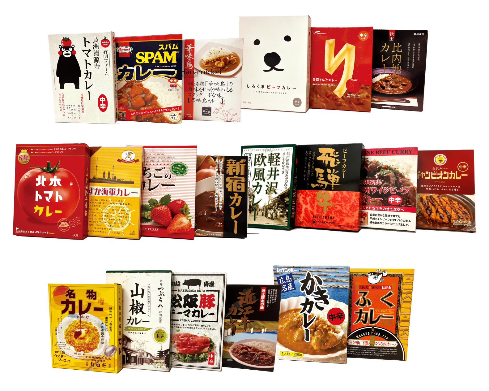 北野エース名物、本棚のようなカレー売場から、全国各地のレトルトカレーをチョイスしたおすすめセットです。※写真は福袋の一部です。
