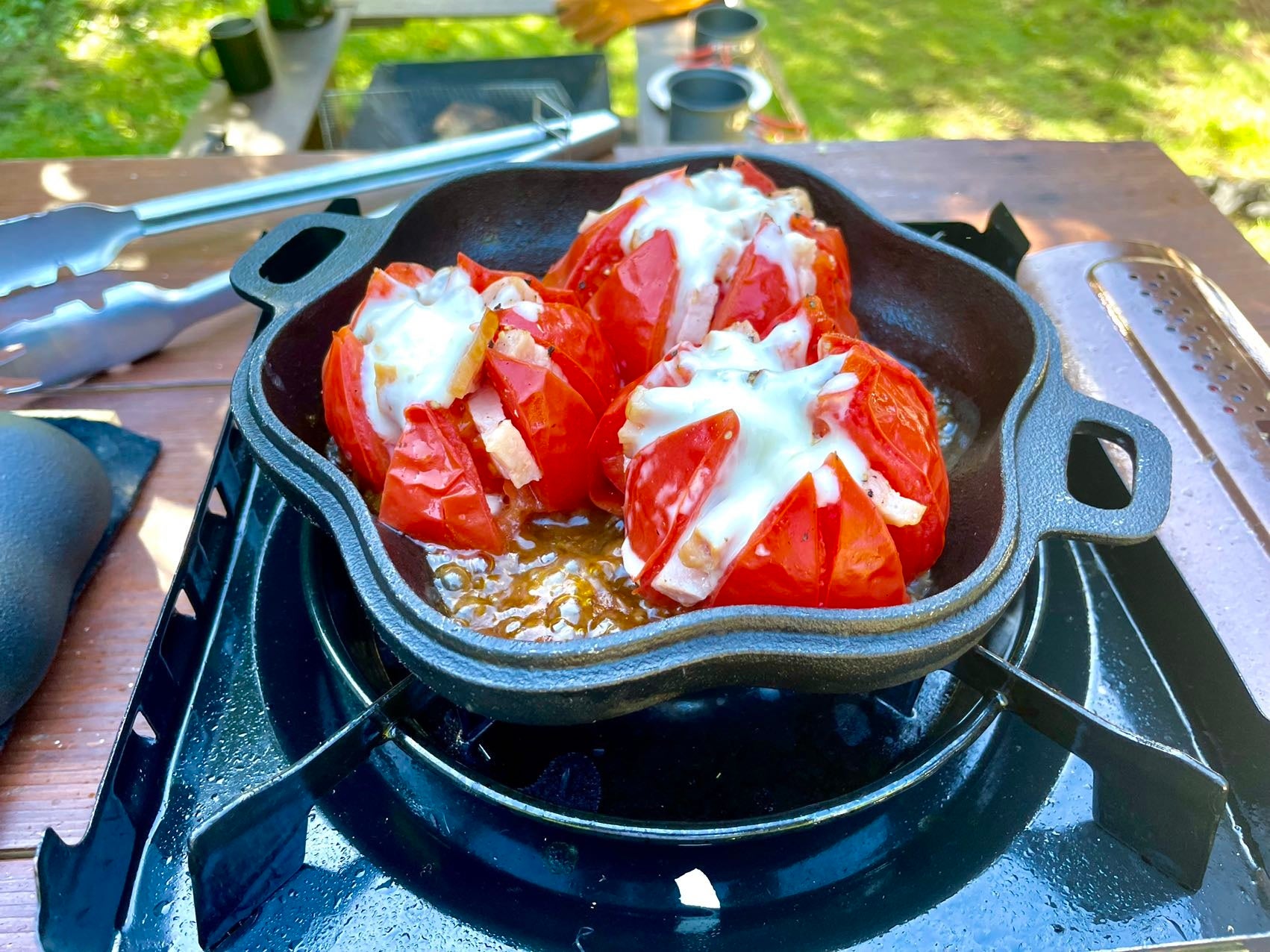 トマトに切れ込みを入れて、ベーコン、黒コショウ。追加でオリーブオイルとととろけるチーズを入れたら完成。