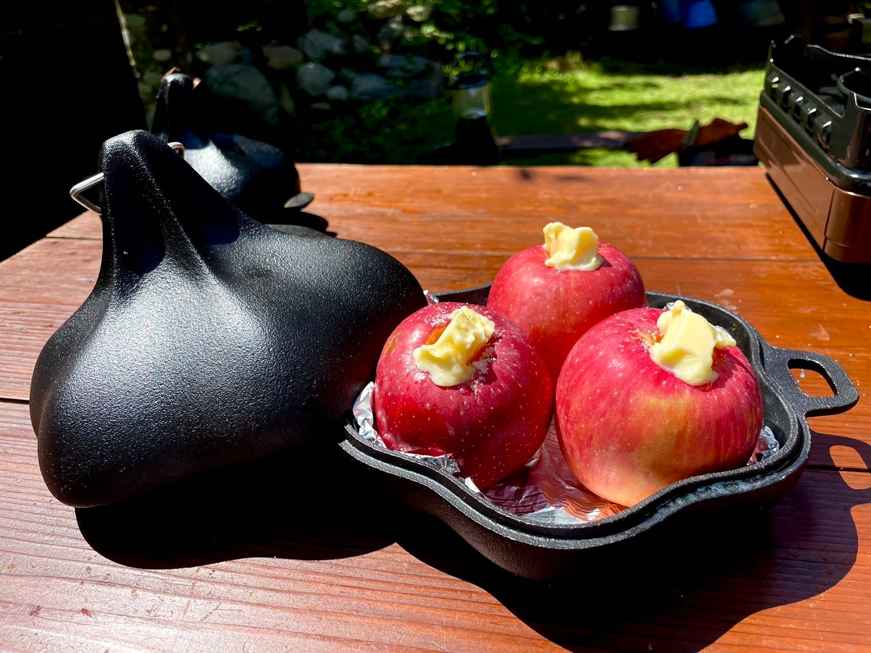 一般的な大きさのりんごだと3個入ります。グラニュー糖、バターを入れて最後にシナモンシュガーやはちみつを掛けるとキャンプ場で絶品のスイーツが完成