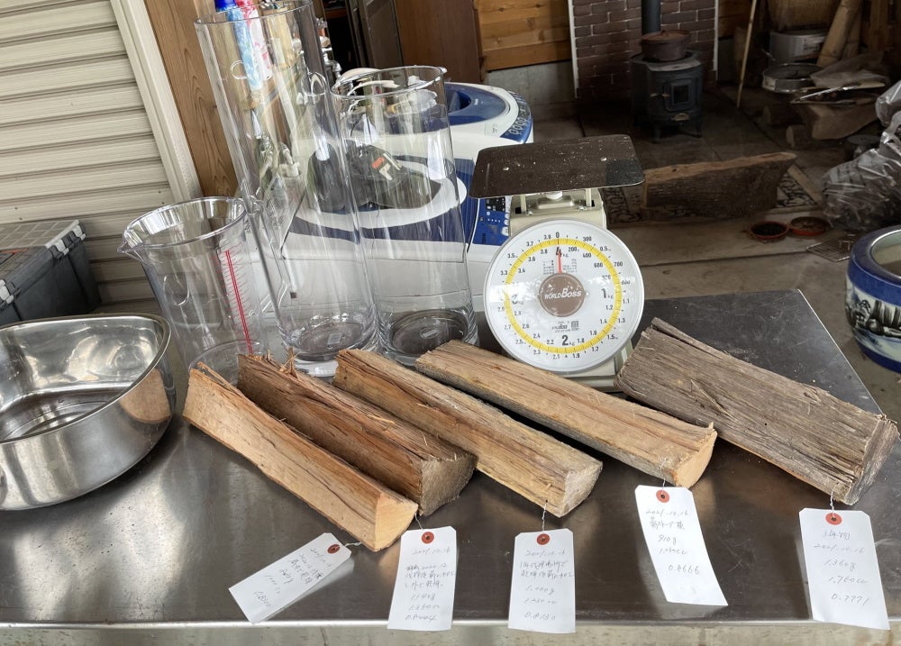 作っている薪がどのくらい乾燥すれば燃料として最適な薪になるのか、薪の乾燥状態を数値化しようと実験しました。