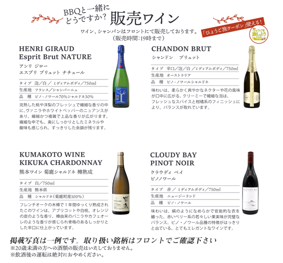 かねてより、お酒を販売して欲しいと多数のお声を頂いておりましたが、この度アルコールの販売が行える運びとなりました。フロントにてワインやビール等のアルコールをお求めいただけます。全国旅行支援で配布のひょうご旅クーポンもご利用可能です。販売時間など、お取扱いについての詳細はこちらのページをご覧ください。