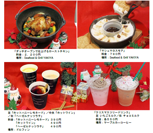 島内のレストランや軽飲食店舗では、ダッチオーブンでお客さまご自身に仕上げていただくローストチキンやマシュマロスモア、ホットワインなど、クリスマスにぴったりのオリジナルメニューが登場いたします。心も体も温まるメニューを多数ご用意しておりますので、寒い冬も存分にシーパラをお楽しみください。