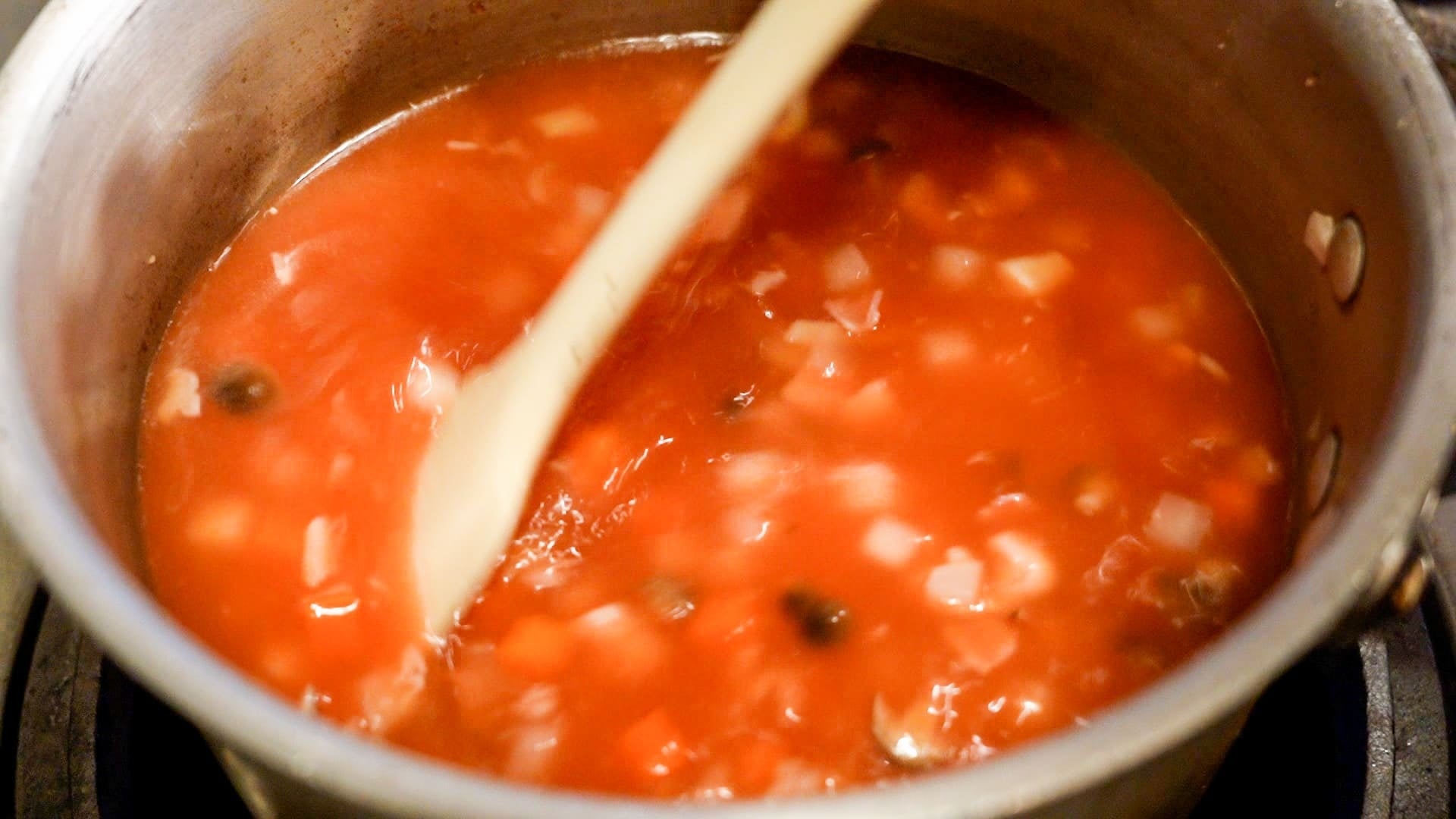 6、野菜ジュース、コンソメ、ローリエ、押し麦を入れ具材の少し上まで水を加え20-30分煮込む。
