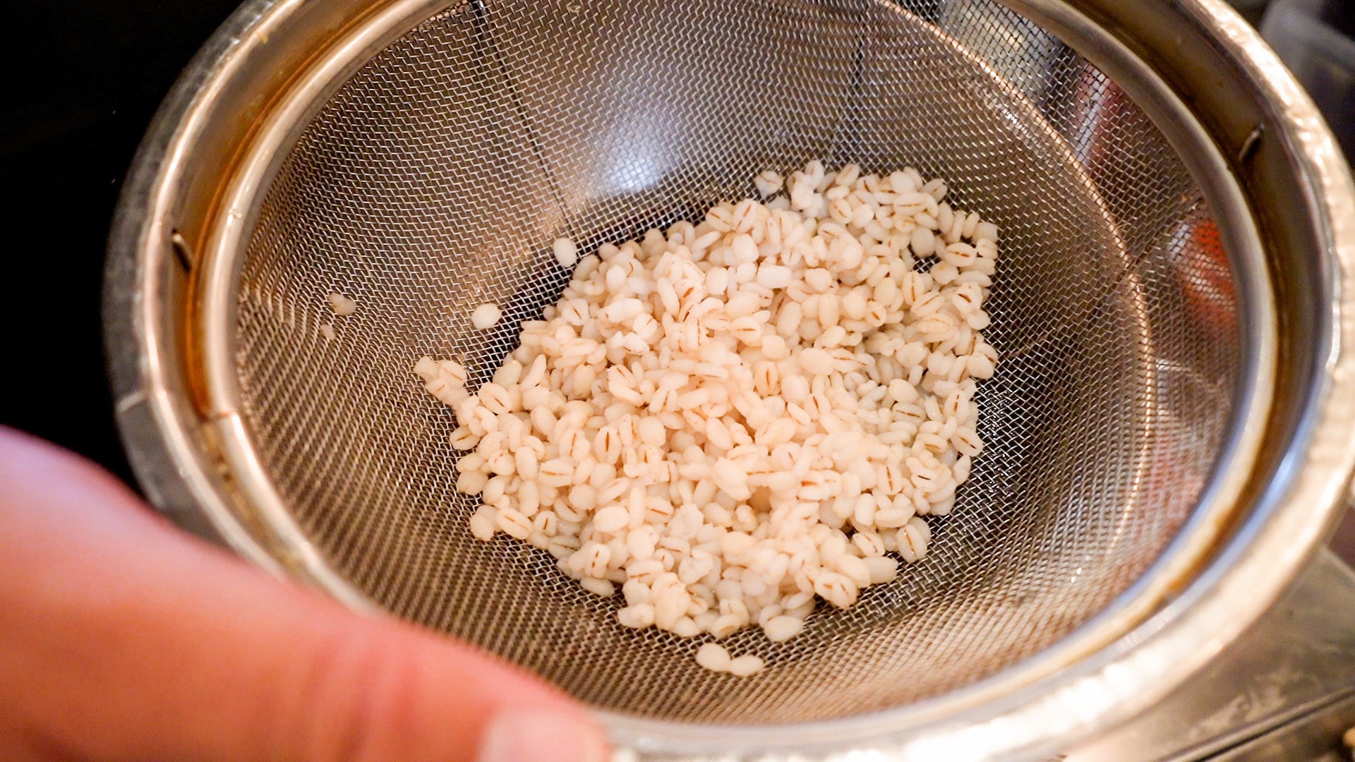 1、鍋にお湯を沸かし押し麦を20分茹でてザルにあけておく。