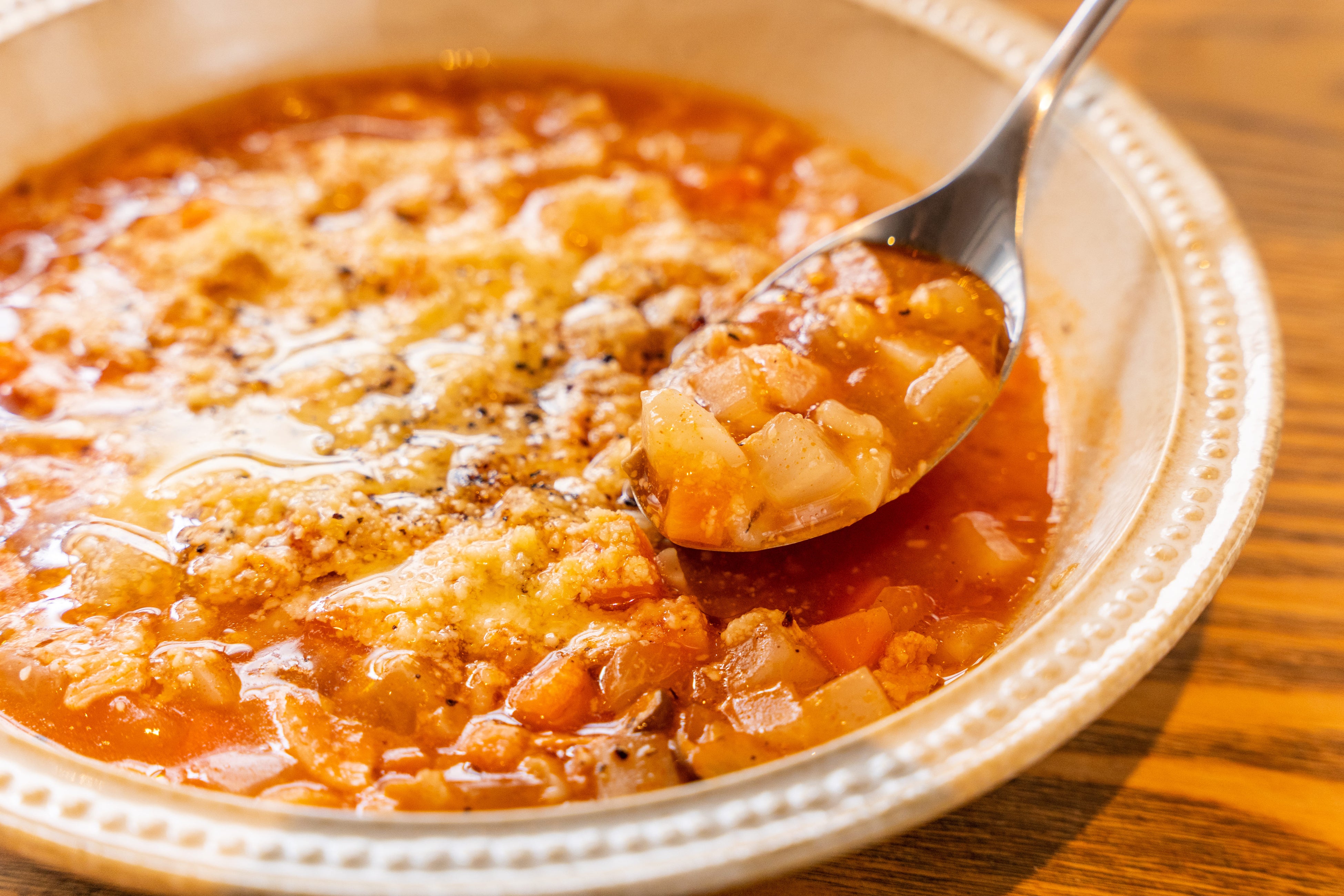 ミネストローネに溶け込んだ食材の出汁がほうとうに染み込み、野菜の旨味を吸ったおいしいほうとうになります。食べごたえもあり、食べるスープとしてワンランクアップするアレンジです。