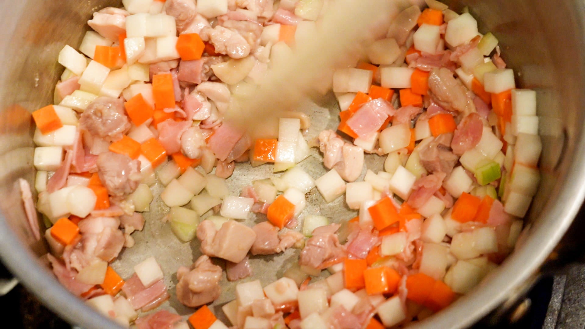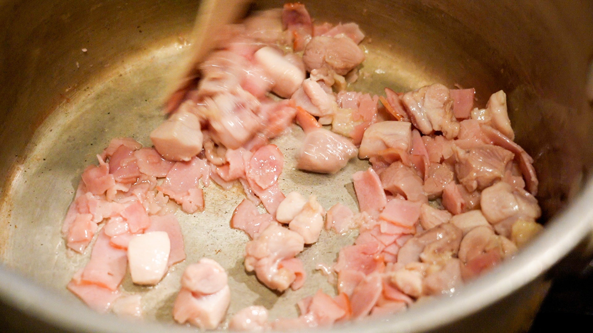 4、鍋に油をひいて(分量外)ベーコン、鶏もも肉を炒める。