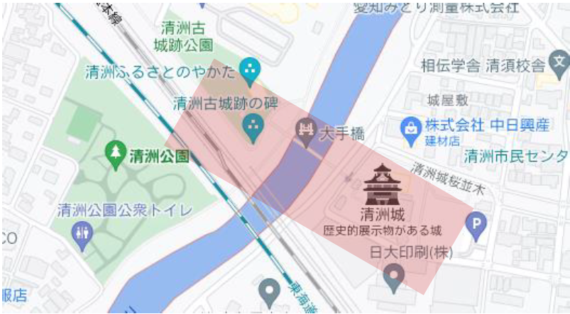 清洲城・清洲古城跡公園周辺(五条川にかかる大手橋をはさんだ左右両岸)