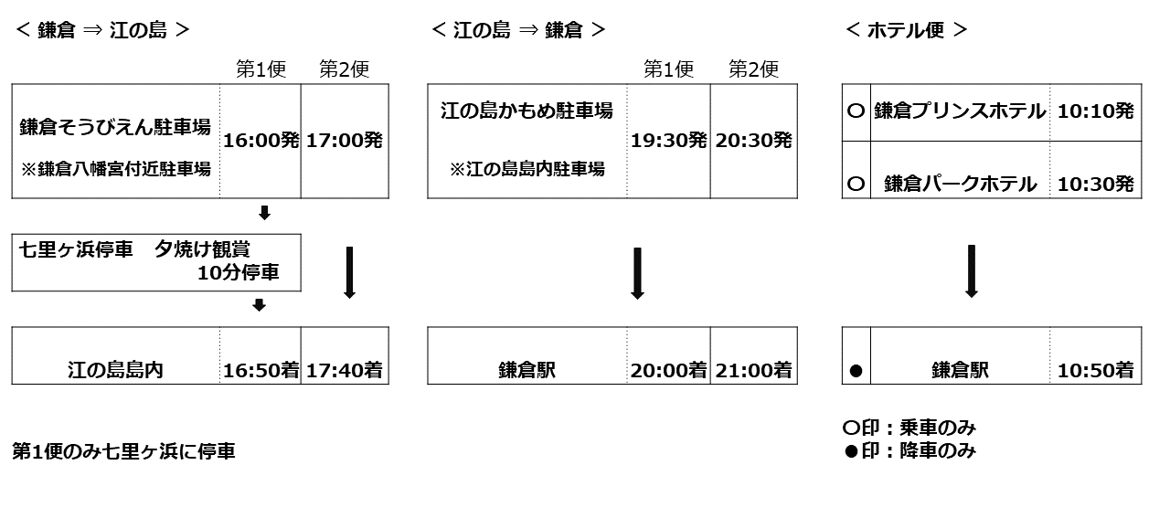株式会社ヴァル研究所が開発するオンライン座席システム「mixwayBooking」にてお客様自身で座席を予約していただきます。ご乗車日は、座席予約の確認画面を係員に提示してください。ホテル便につきましては、鎌倉プリンスホテルまたは鎌倉パークホテルをご利用したお客様を対象に各宿泊施設にて座席の予約を行い、ご乗車いただけます。各便の乗車定員は40名とさせていただきます。