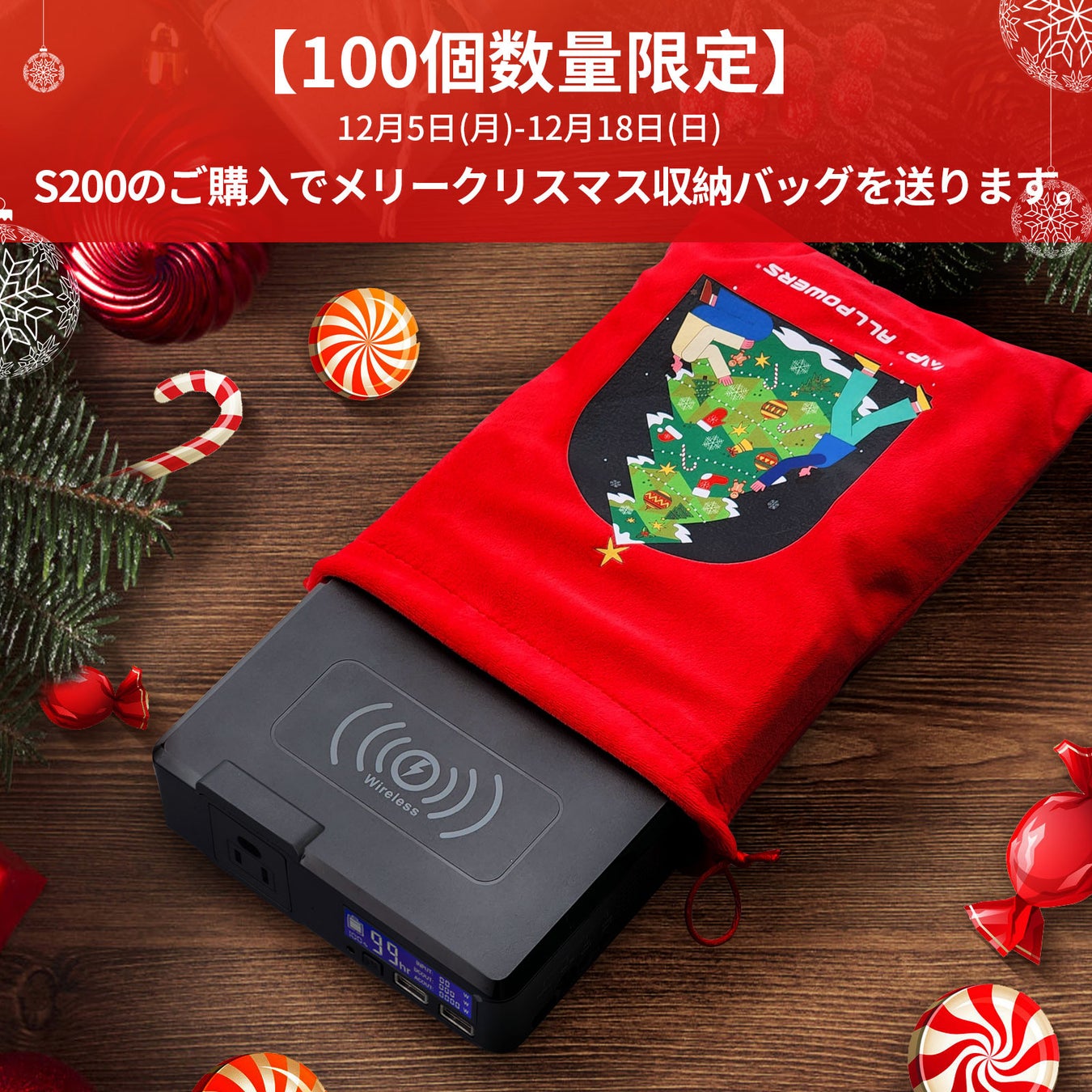 クリスマスに向けて、ALLPOWERSからも感謝を込めて、特別プレゼントを用意しました。12月5日から18日まで、ポータブル電源S200をご購入頂いただいた方にクリスマス収納袋を贈りします。自身へのご褒美と、大切な方へのギフトを探している方は、ぜひお見逃しなく。