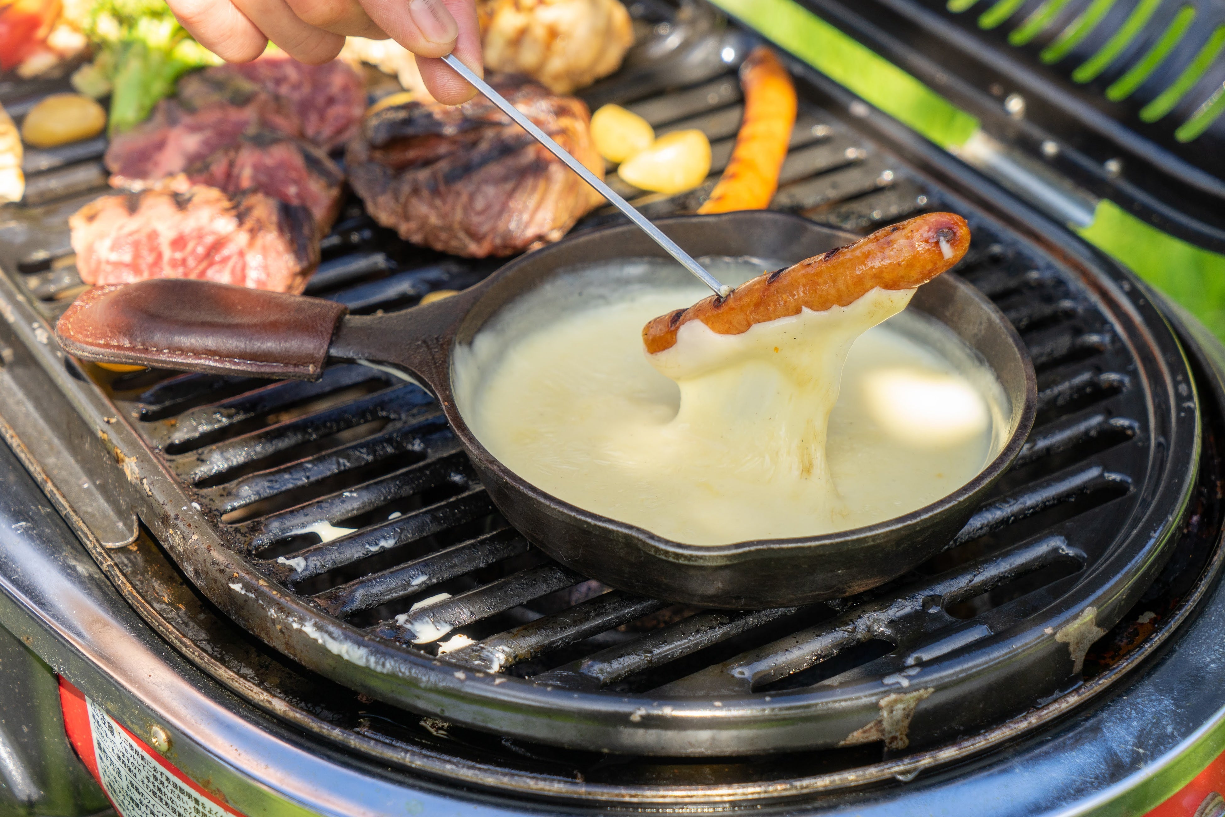 今が旬の野菜やソーセージをグリルし、ゴーダ、モッツァレラ、チェダーなど3種のチーズを混ぜ合わせたチーズフォンュデュを絡ませて食べる食材は絶品。大自然の中で焚き火をみんなで囲み、温まりながら食事を楽しむ非日常的な空間はいつものBBQとは違う魅力の一つ。