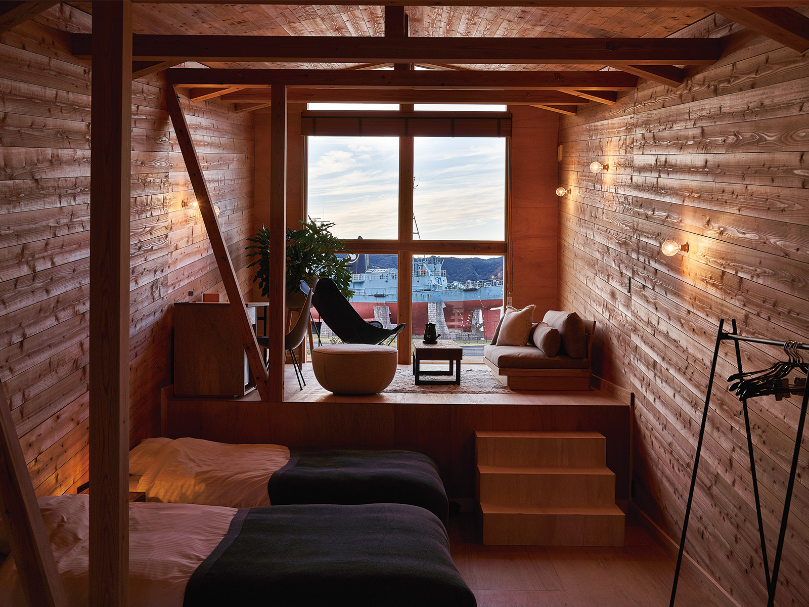 2階建ての客室からは、熊野灘と山々が臨めます。1階はプライベートデッキとシャワーブース、トイレを設置。ゆとりあるプライベート空間を確保した設計です。