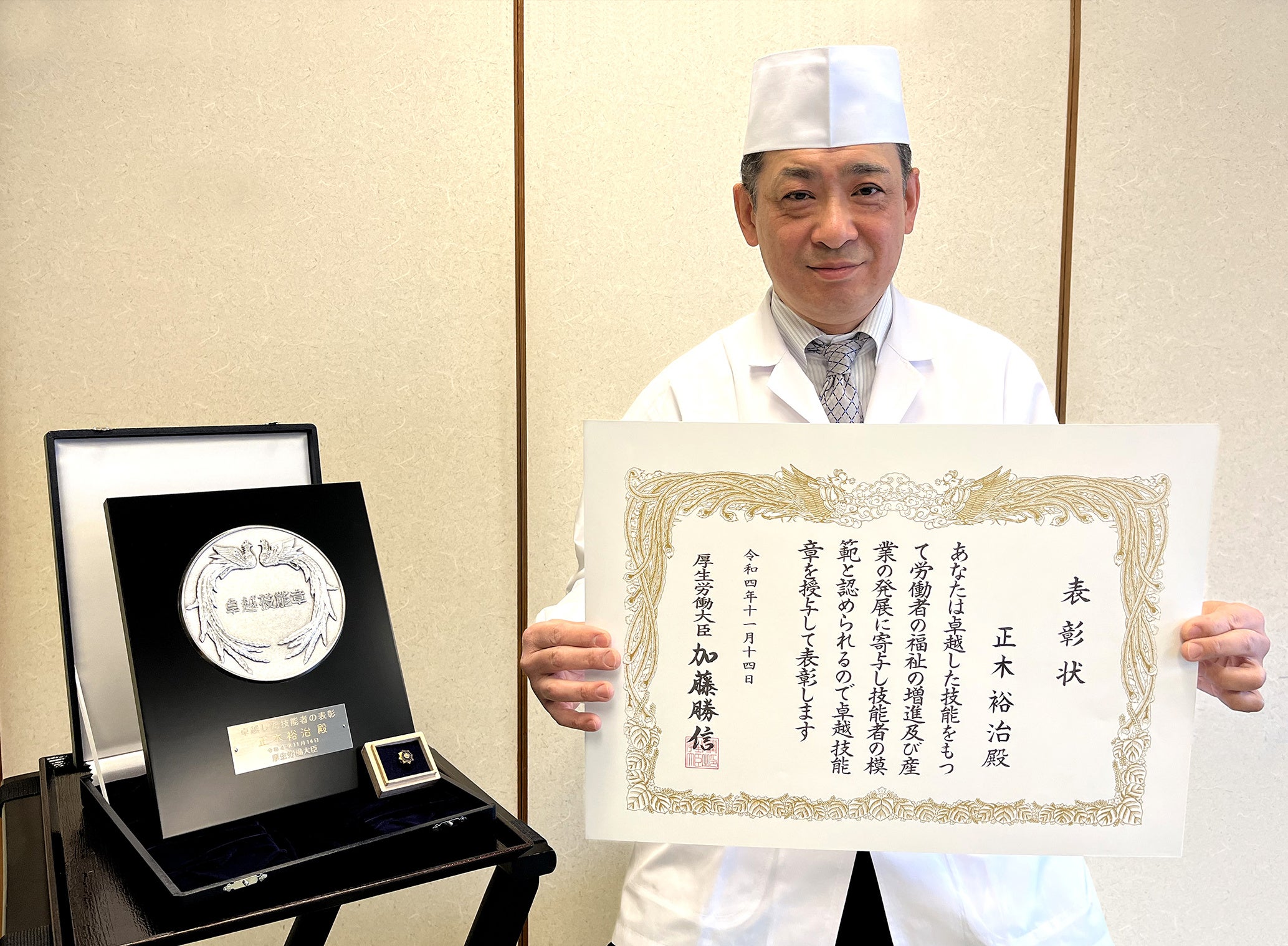 正木裕治は、伝統ある調理技法と自らの創作料理を駆使し、信州安曇野の厳選された食材を用いた多くの料理が賞され、さらには、日本料理中央試験委員、ハラール研修有識者会議委員など、後進の技能者育成及びハラール対応の料理も伝承している点を高く評価され、現代の名工20部門のうち、長野県では2人目の「日本料理調理人部門」にて受賞の栄に浴しました。