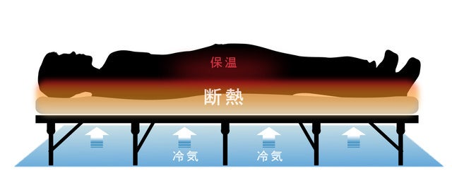 インフレーターマットとコットの組み合わせは、腰と体への負担を軽減するだけでなく、地表からの冷気や熱の影響を受けにくくします。