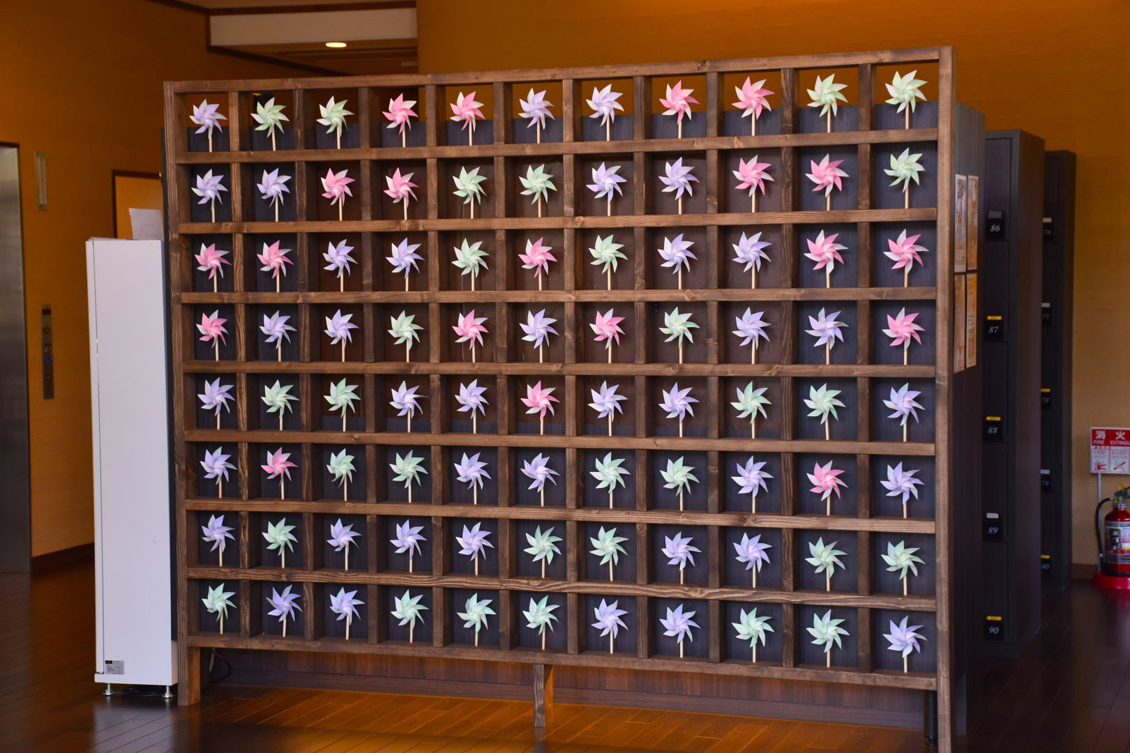 本谷温泉館(愛媛県西条市河之内甲494)は今冬より、地元の特産品である周桑手すき和紙の温かさを来館者に伝える活動「千の風車プロジェクト」を開始。このたび、館内入口にて展示を開始しました。