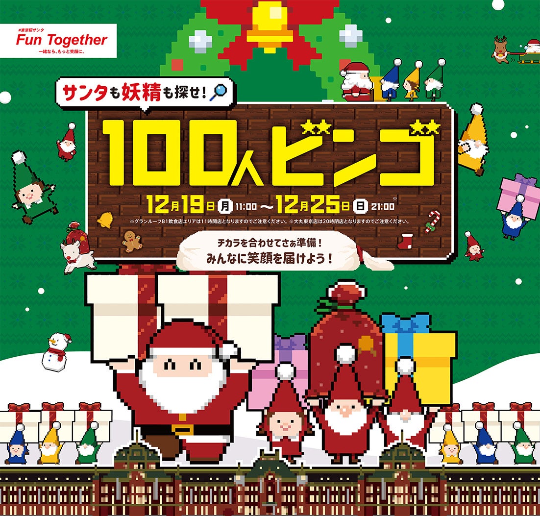 一般社団法人東京ステーションシティ運営協議会は、2022年12月19日(月)から12月25日(日)の期間、東京駅を舞台にサンタを探し出す毎年恒例のクリスマスイベント「サンタも妖精も探せ!100人ビンゴ」を開催いたします。