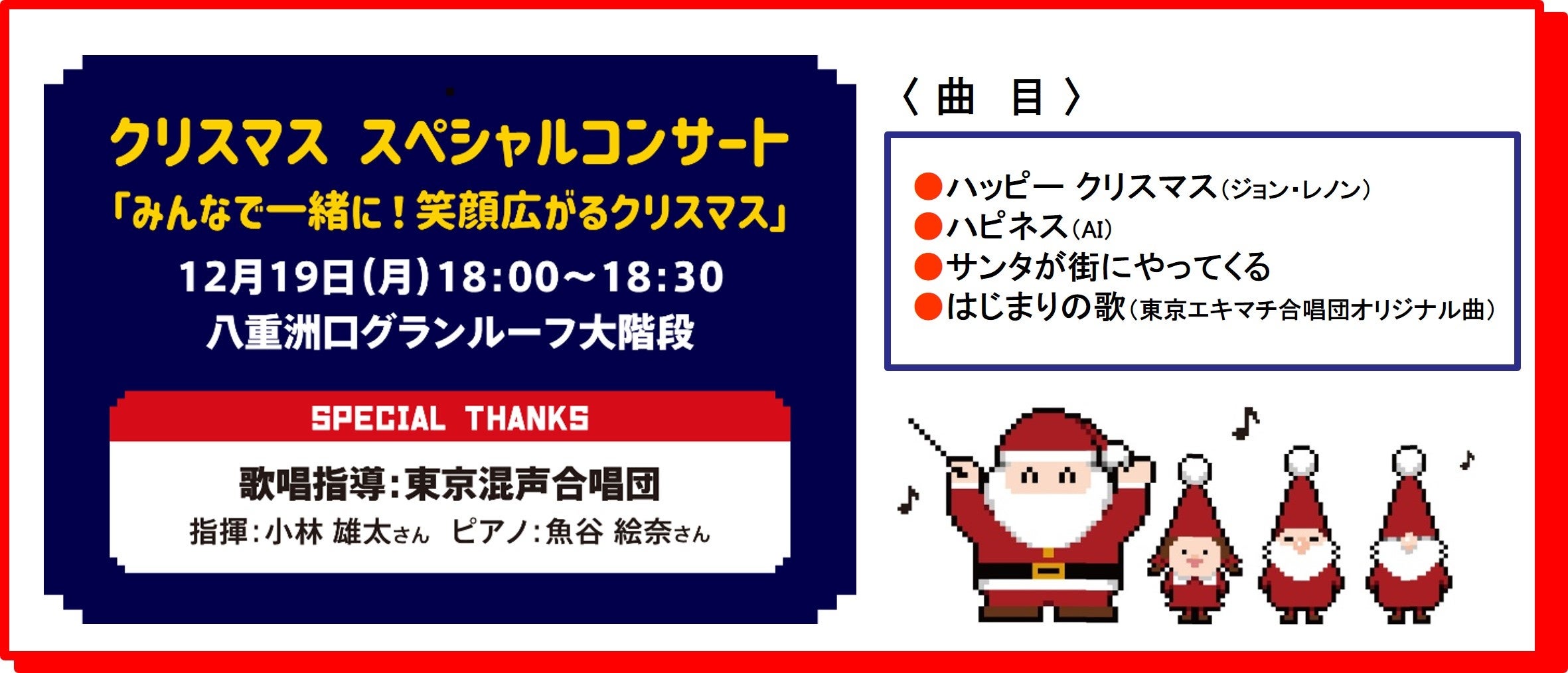 本イベント初日の12月19日にはオープニングセレモニーとして、3年ぶりに約30名の「東京エキマチ合唱団」によるクリスマス スペシャルコンサートを行います。