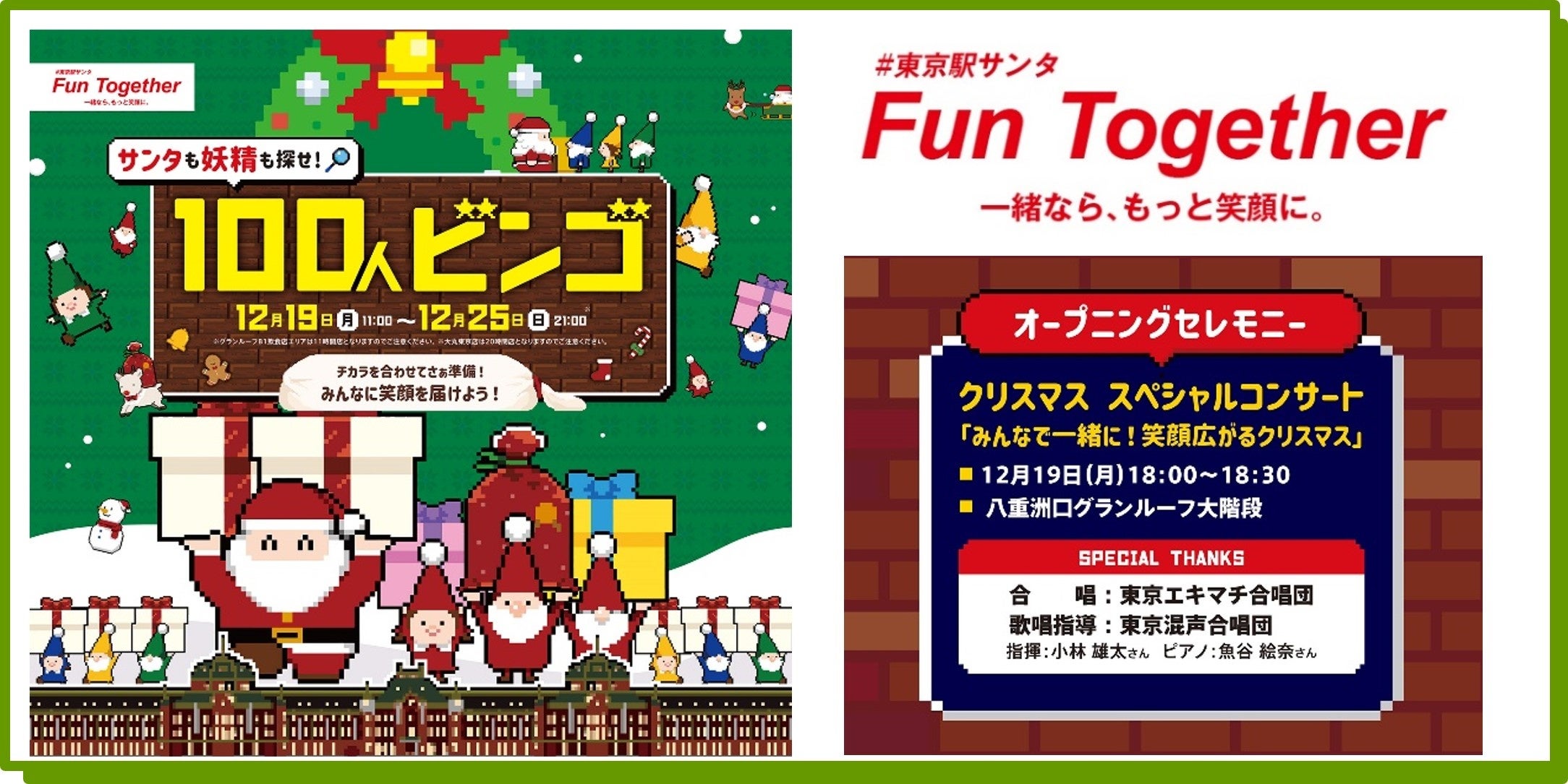 コロナ禍の長いトンネルを抜け、一歩ずつ前に進み始めた2022年。私たちは「Fun Together~一緒なら、もっと笑顔に。」を合言葉に、毎年多くの方にご参加いただく「100人ビンゴ」、東京駅に澄んだ歌声が響く「スペシャルコンサート」など、デジタルとリアルを一つにした新しいカタチのイベントを通して、東京駅で過ごす皆さまに笑顔をお届けします。