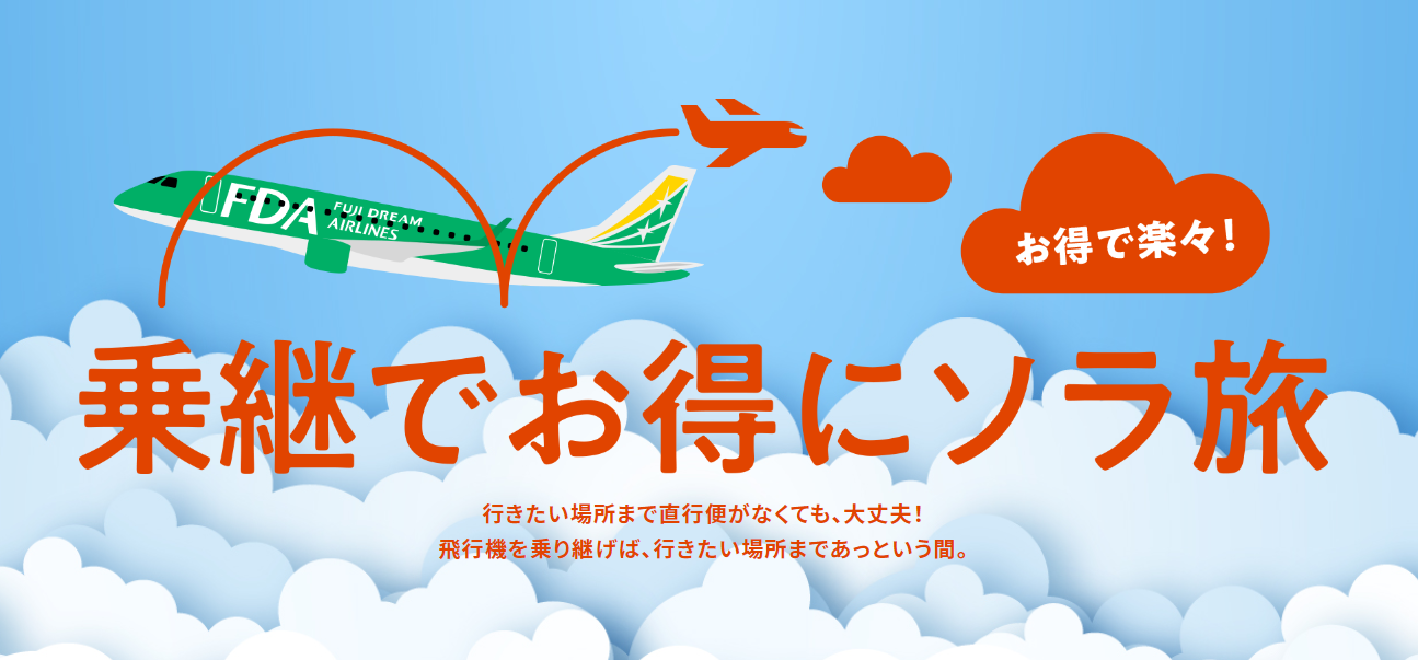 株式会社フジドリームエアラインズ(略称:FDA、本社:静岡県静岡市、代表取締役社長:楠瀬 俊一)は、日本各地を乗継で結ぶツアー商品「乗継でお得にソラ旅」を旅行会社と新たに企画し、共同で販売いたします。