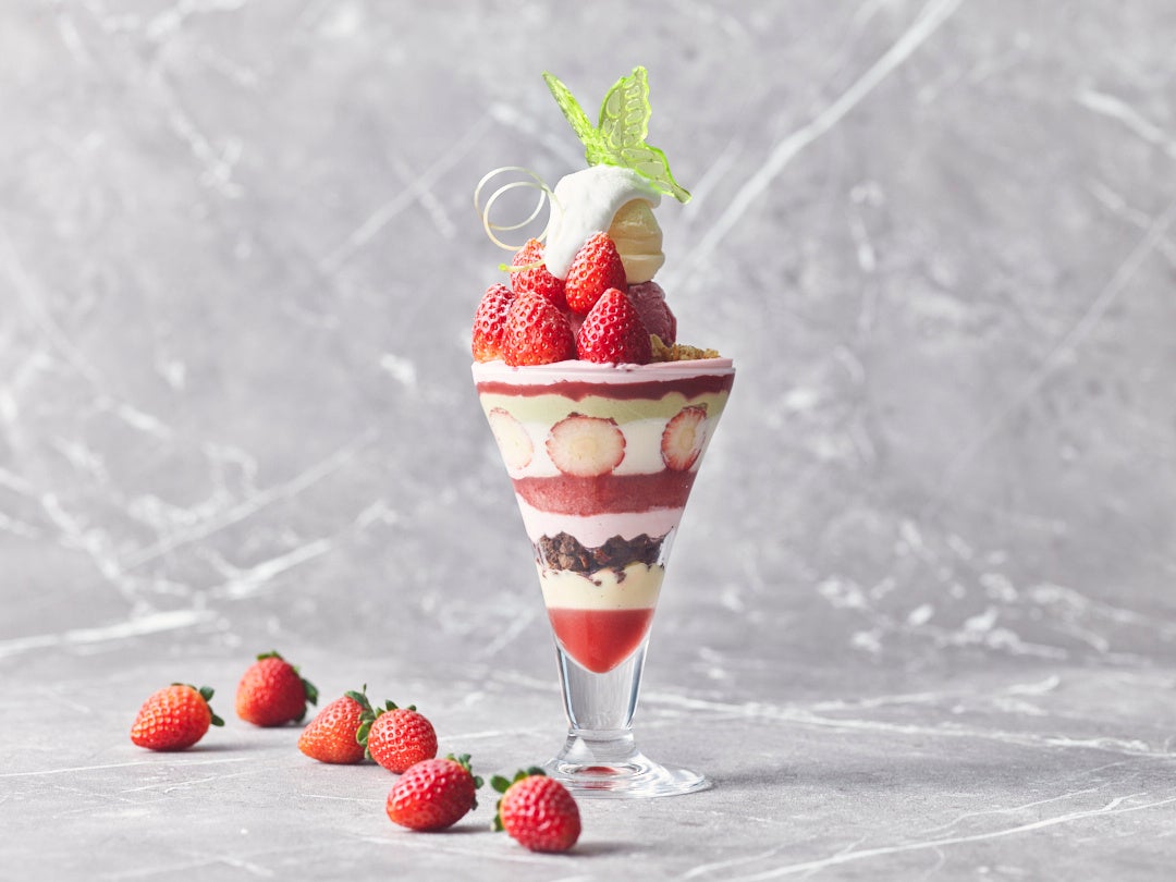 赤いちごにはカモミールを重ねて。パンナコッタやカスタードクリームに忍ばせたほのかなカモミールの香りが、エレガントな余韻をもたらします。トップのいちごは瑞々しいフレッシュさが心地よいとちあいかを、ジュレやクリームでサンドしたパフェの中には酸味と甘みのバランスが絶妙なとちおとめを。それぞれ使い分け、いちごの美味しさをとことん味わえる、ショートケーキのようなパフェに仕上げました。