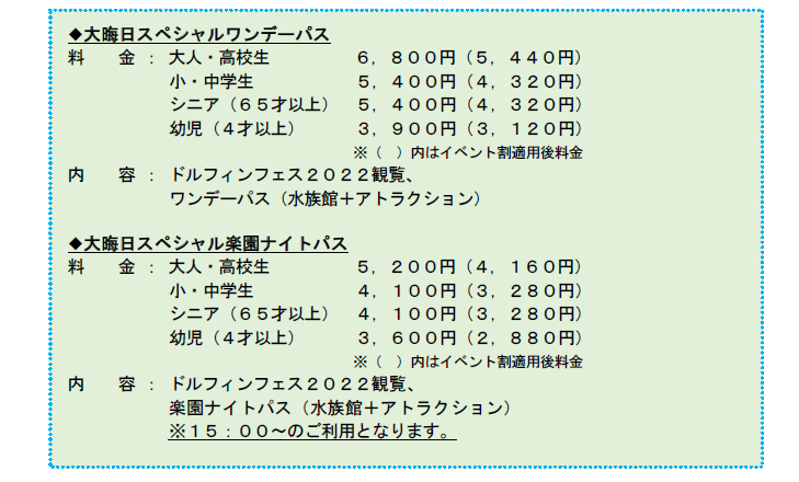シーパラダイスでは、「ドルフィンフェス2022」がご覧いただけるチケットと、水族館とアトラクションがセットになったチケットを販売いたします。楽園ナイトパスは15時から利用可能なため、お好きな時間にお越しいただき、聖なる夜に水族館やアトラクション、ご飲食をお楽しみください。詳細は公式HPをご確認ください。