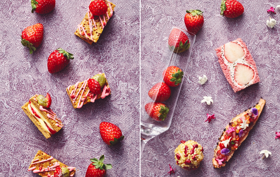 サクサクのパイ生地をドレッシーにストロベリーフォンダンでグラサージュしたミルフィーユ、チーズケーキにはストロベリージュレをストールのように纏わせて可憐な美しさを、スパイスとエディブルフラワーで彩り華やかに仕上げたサーモンのたたきは、食べるのが惜しいほどフォトジェニックに。