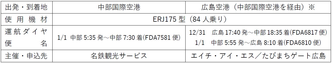 ※12月31日に広島空港から中部国際空港へ移動、前泊をし、翌日に初日の出を鑑賞しながら広島空港へ帰着する1泊2日の往復行程です。