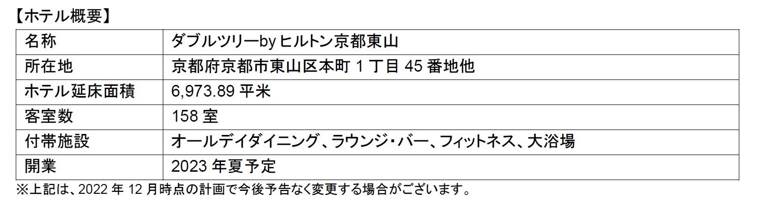 ヒルトン 日本・韓国・ミクロネシア地区(所在地:東京都新宿区、代表:ティモシー・ソーパー)、公共投資顧問株式会社(本社:東京都中央区、代表取締役:三田 剛正)、および株式会社サンケイビル(本社:東京都千代田区、代表取締役:飯島 一暢)は、京都で「ダブルツリーbyヒルトン京都東山」を開業することを発表しました。同ホテルは、公共投資顧問株式会社がアセットマネジメント業務を行う合同会社DT京都清水が信託受益権を保有し、株式会社サンケイビルがプロジェクトマネジメント業務を行い、株式会社グランビスタ ホテル&リゾートの100%子会社であるDKホテルマネジメント社が経営、ヒルトンが運営を行い、2023年夏の開業を目指します。