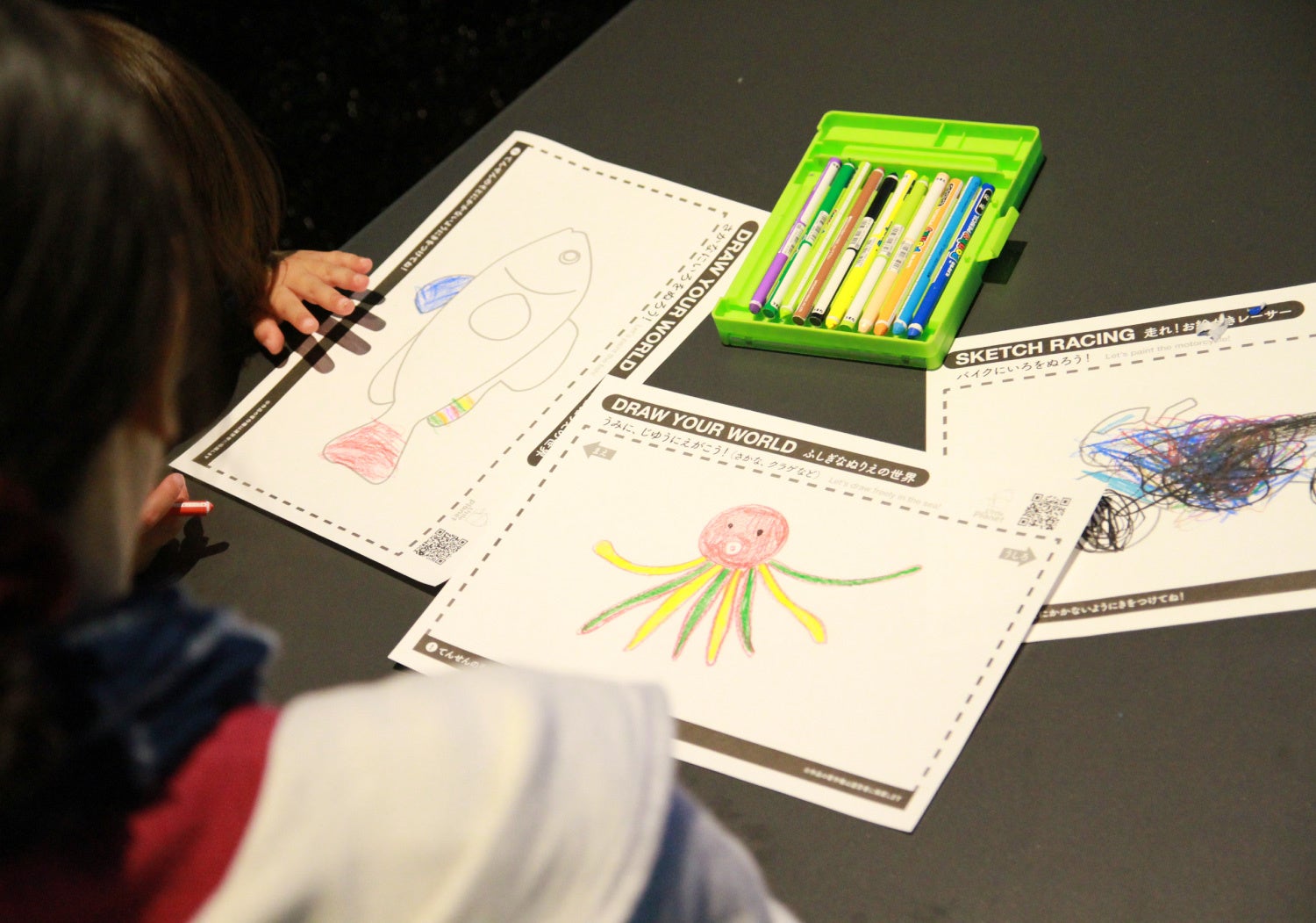 「DRAW YOUR WORLD」は、3Dグラフィックスを全面的に取り入れた“絵に命がやどる”デジタルアトラクションです。紙に描いた絵を専用のスキャナーで読み取ると、大型スクリーンの中で生き生きと動き出します。