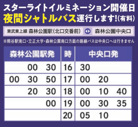 ・開催日には駐車場や周辺道路の混雑・渋滞が予想されます。ご来園の際は、夜間シャトルバス(有料)をご活用ください。