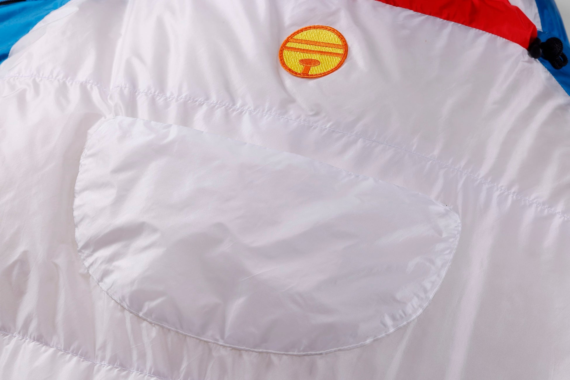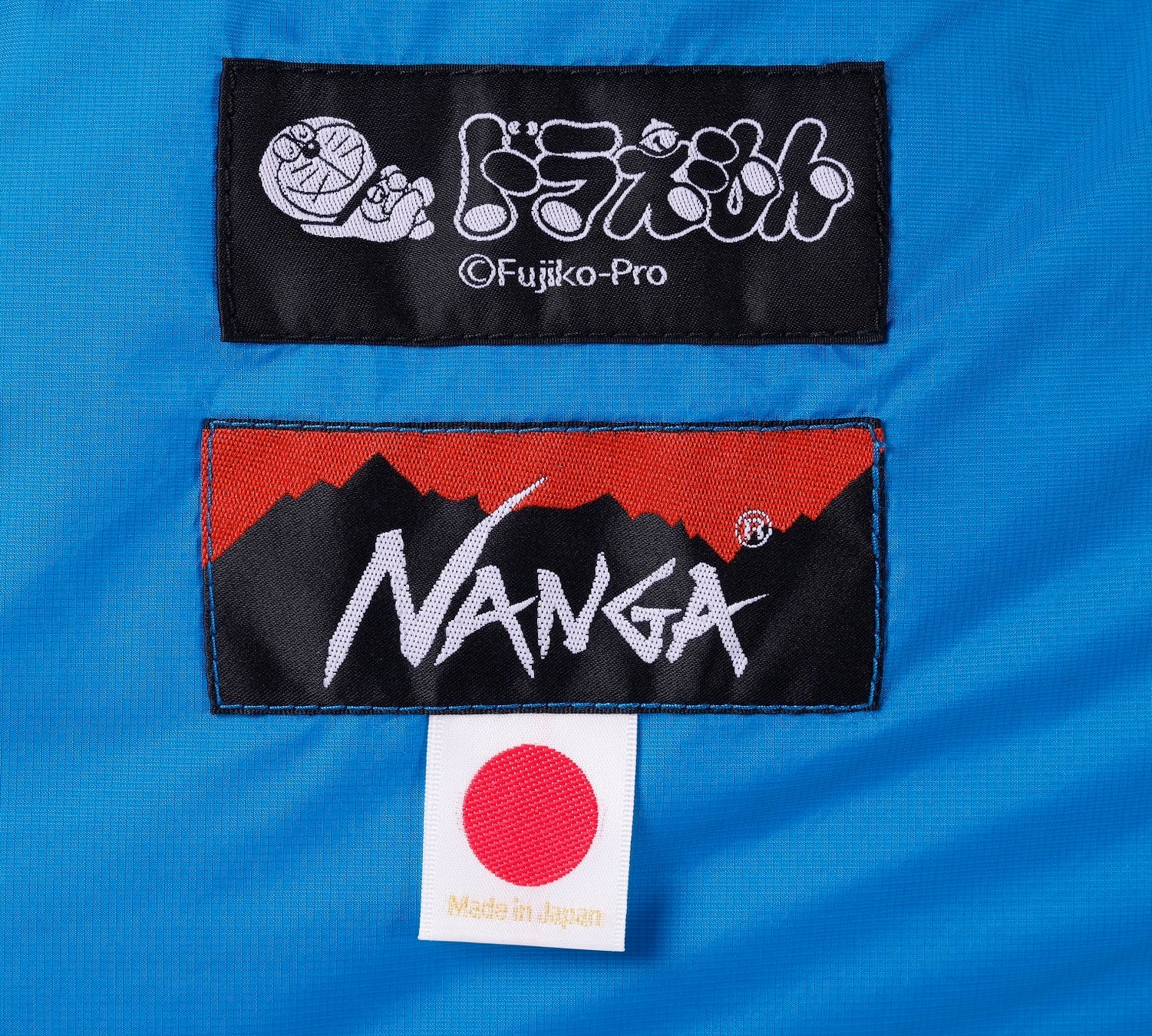 青・白・赤でドラえもんをイメージしたカラーリングに加え、表生地の白部分になんと首輪の鈴や四次元ポケットも再現。裏地には総柄でコミカルなドラえもんのイラストをプリントしています。ナンガとドラえもん、それぞれの織りネームもつきます。
