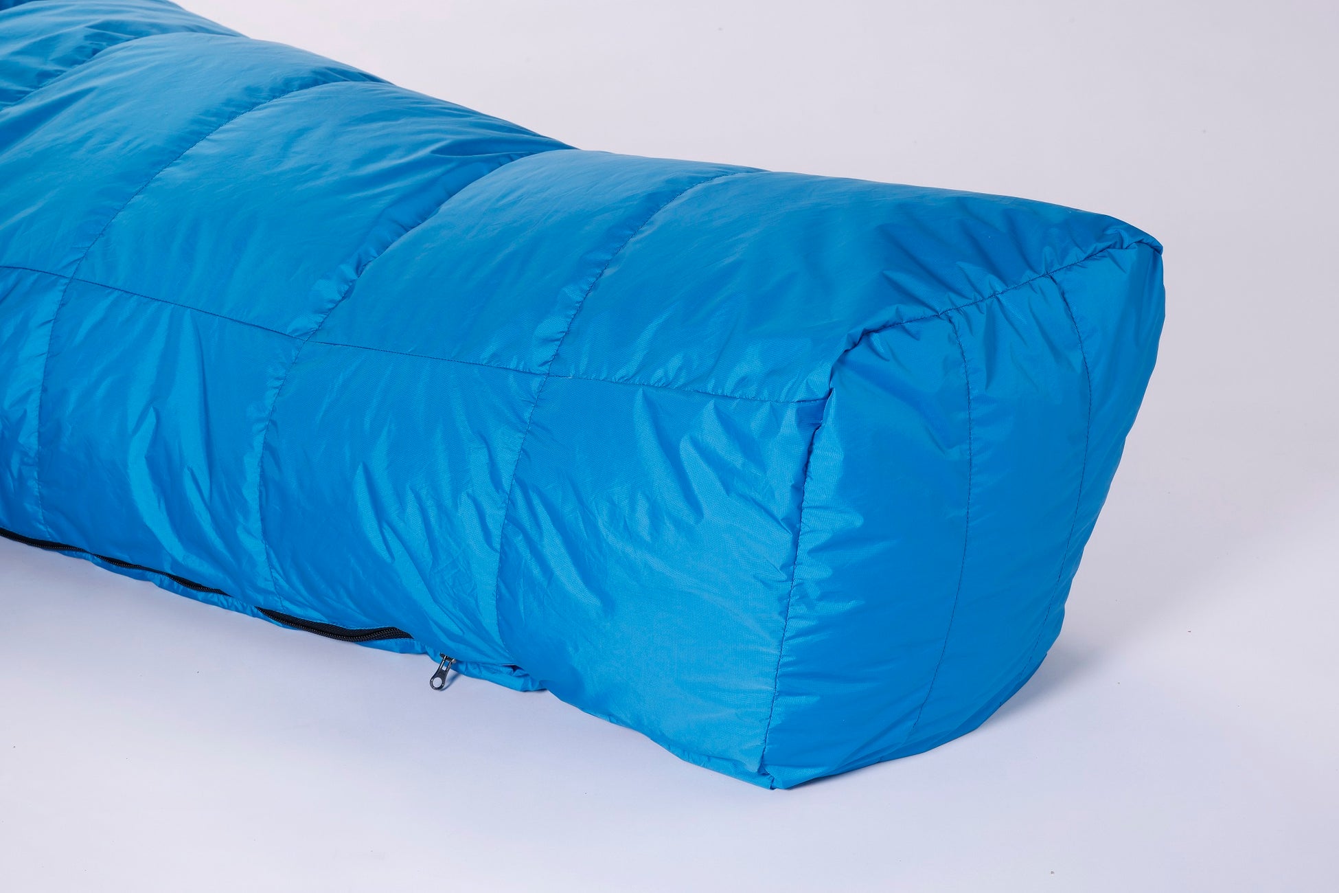 足先部分に余裕を持たせることで、足が窮屈に感じない形状。多めに羽毛を封入することで冷えを防いでくれます。このようにどんな体勢でもストレスを感じることなく、効率的に保温するための機能が数多く盛り込まれています。