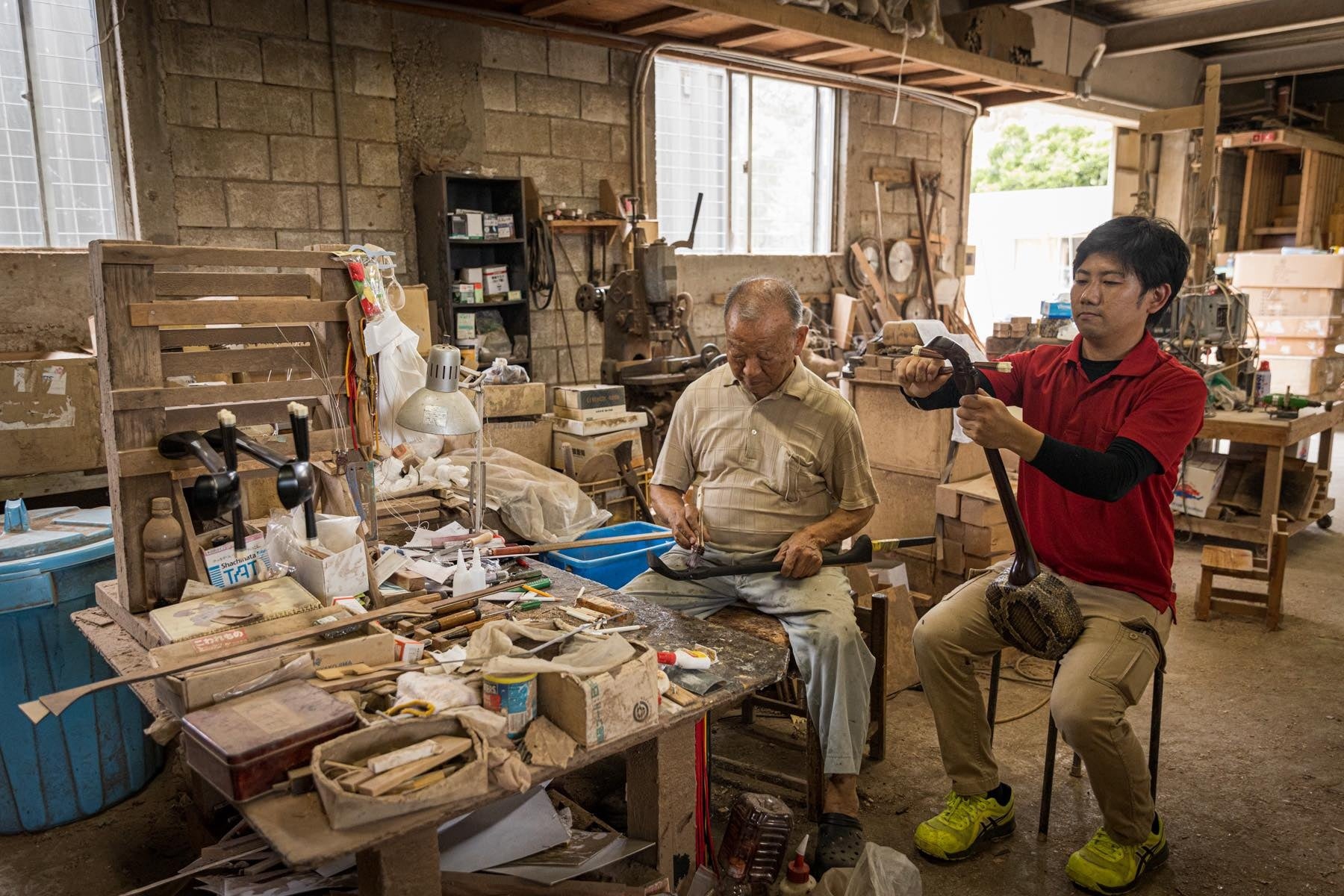 このたび『TIDA』シリーズの第一弾モデルを手掛けたのは、宮古島市で三線と木工品の製作・販売する「宮古木工芸」。創業1961年の老舗三線木工製作所で、島に伝わる手づくりの「伝統技術」と「本物の木」にこだわり、丸太の買い付けから、製材、加工、塗装仕上げまでの全ての工程を行う「沖縄県内唯一の工場」です。創業者である祖父・与儀栄功氏から孫・与儀昌樹氏へと、確かな技術と経験が脈々と引き継がれ、丁寧に作られた製品の数々は、全国の三線・木工品ファンに愛されています。